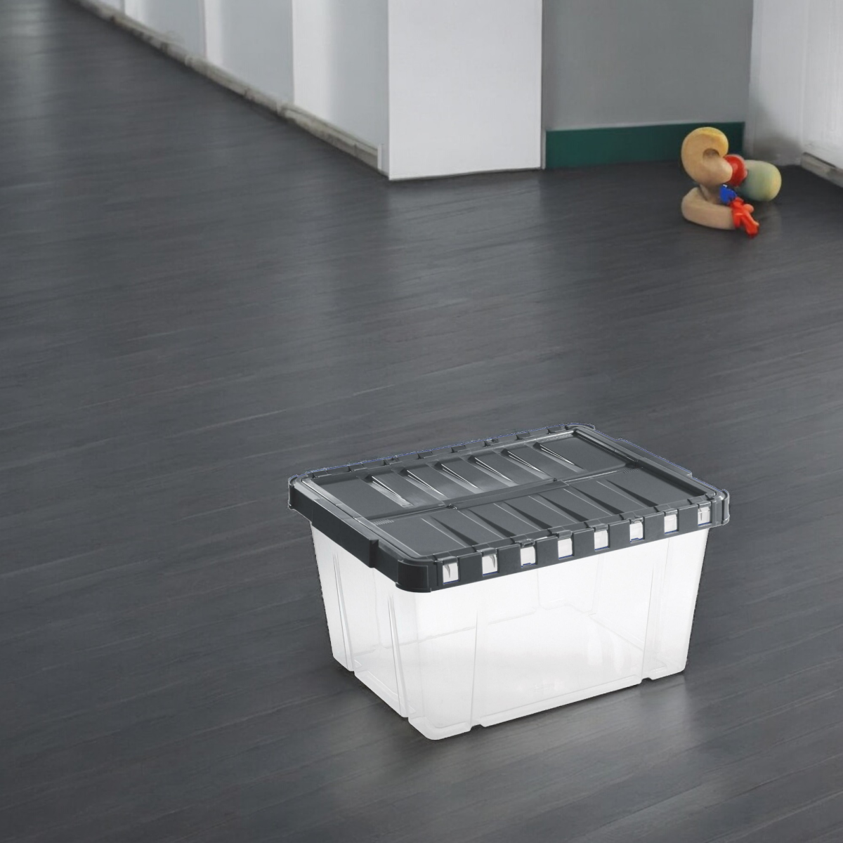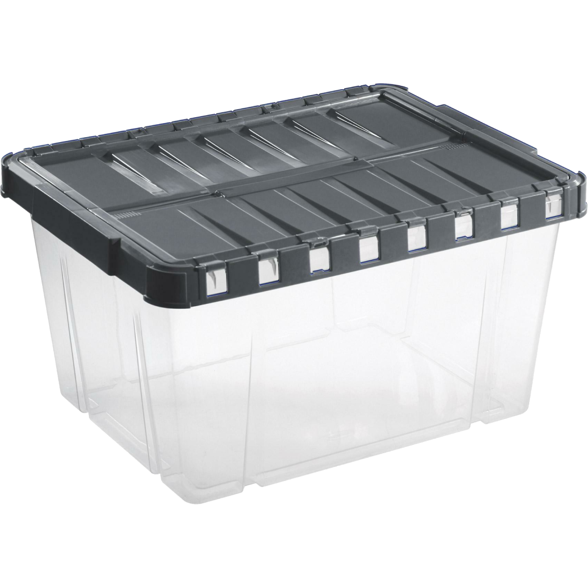 Műanyag, dupla vonalú tároló doboz pillangós fedéllel.