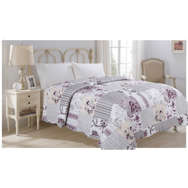 100% poliészter lila-szürke virágos ágytakaró. Mérete 240x220 cm.