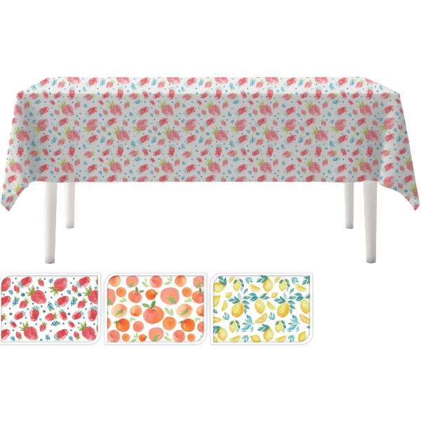 130x180 cm-es asztalterítő 3 féle mintával: barackos, epres, citromos; anyag: felső rész: polipropilén, alj: flanel.