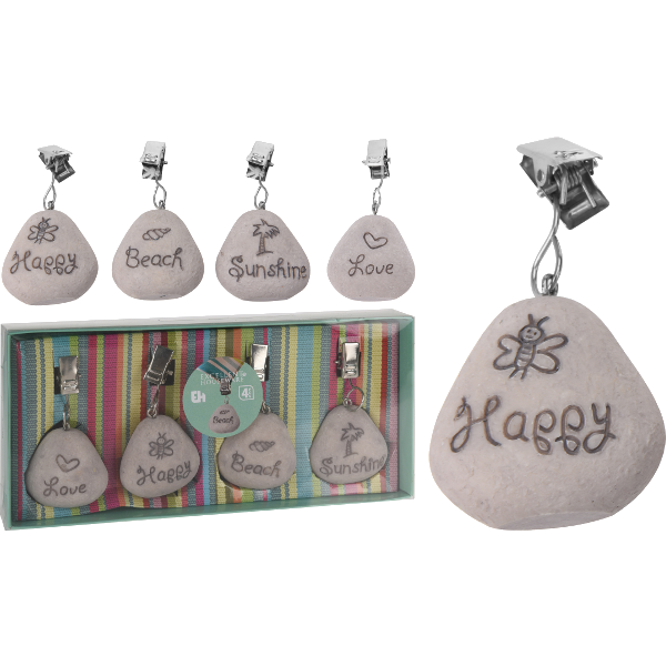 4 db-os terítő csipeszes nehezék szett, műanyag, kő alakú, 30 gr/darab. Szürke, 4 különféle felirattal. Átlagos méret 4,5x4,5 cm.