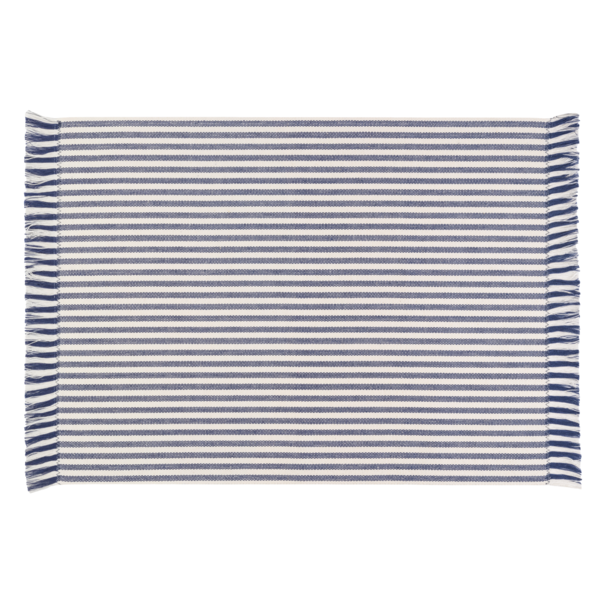 Elegáns textil tányér alátét, amely 100%-ban pamutból készült. Rojtokkal díszítve a szélén és csíkos sötétkék-fehér színben. Oekotex minősítéssel rendelkezik.