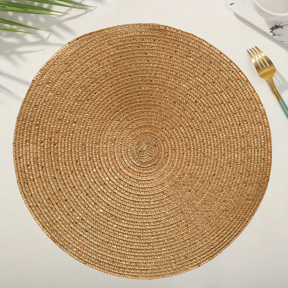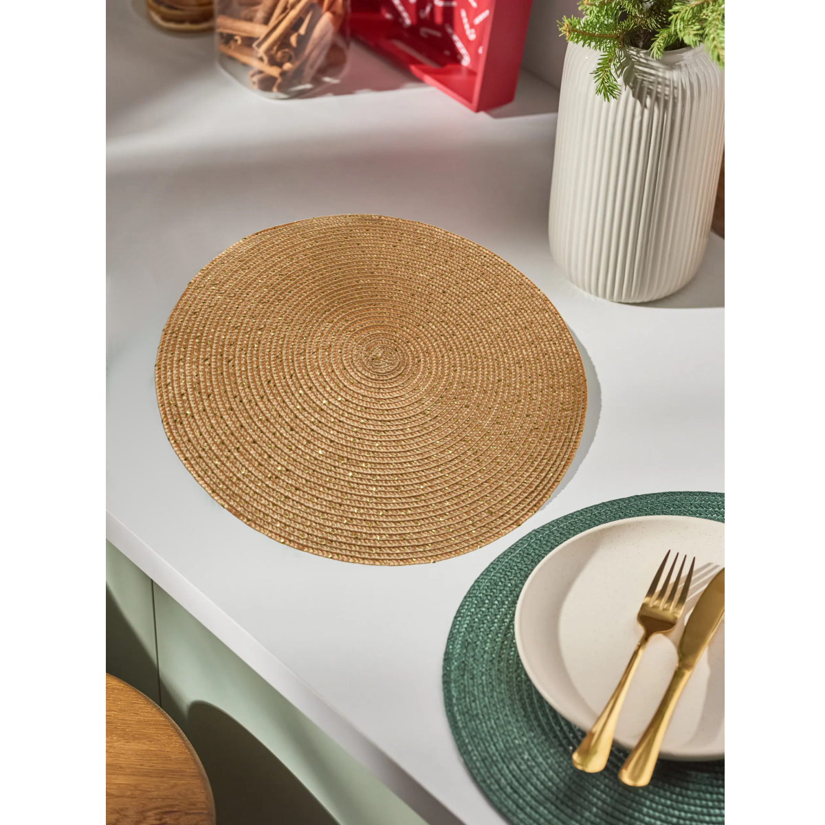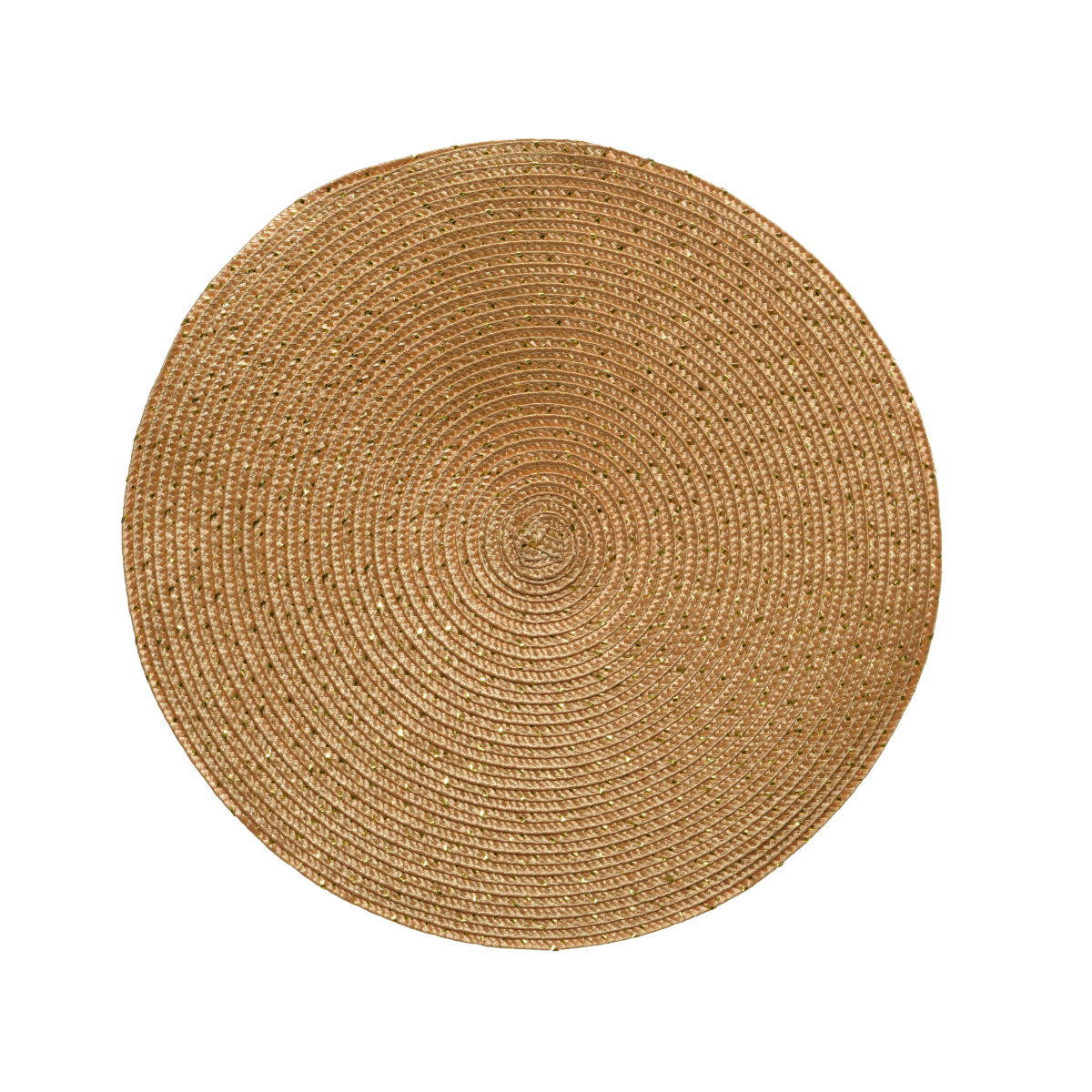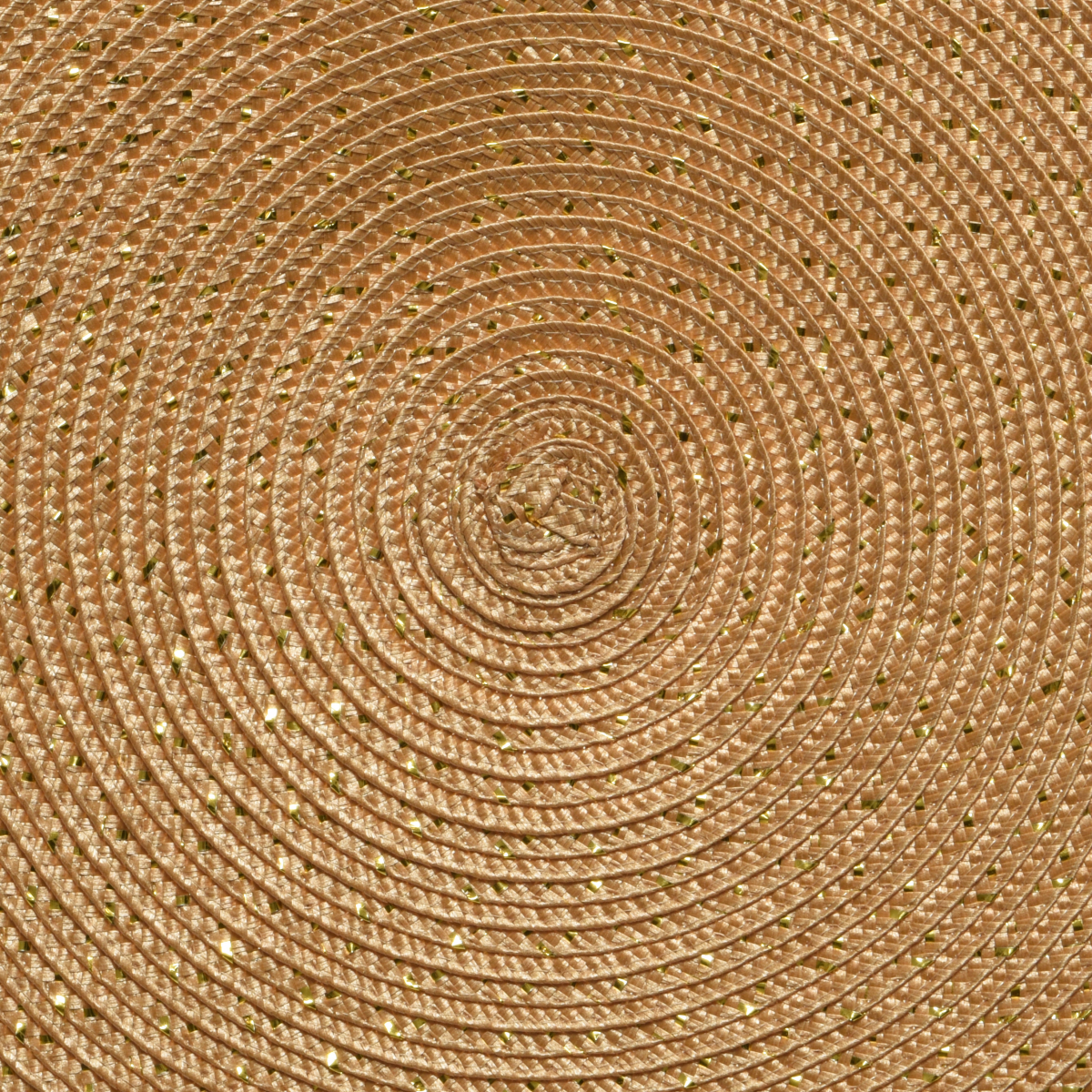 Rattan hatású, kerek formájú tányéralátét, arany színben.