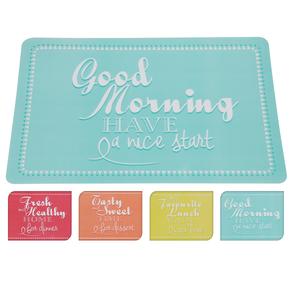 Tányéralátét. 4 féle szöveg és szín. Anyaga: polypropylene. Mérete 43,5x28,5 cm.
