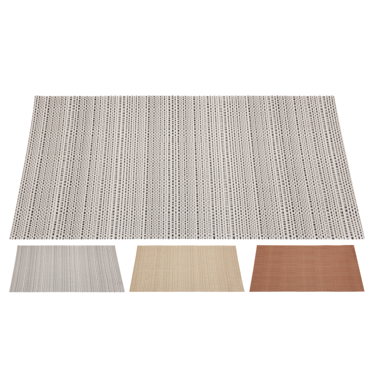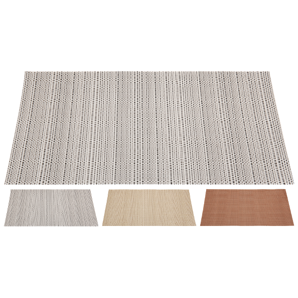 Tányéralátét 3 különféle színben, szövött mintájú (fekete-ezüst, barna-réz, arany-rész). Mérete : 45x30 cm, 100% műanyag bevonattal.