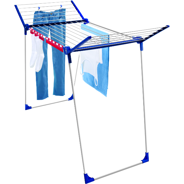 A párhuzamos lábak biztosítják a szárító stabil és kifogástalan állapotát, a 105 cm magas szárnyakon hosszú ruhadarabok száríthatók, a szárítót le lehet hajtani, hogy helyet takarítson meg.