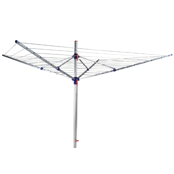 A Vileda Viva Air Ultralight a kertbe leszúrható (lebetonozható) szárító tavasztól őszig remekül használható. A könnyen kinyitható 4 ágú szárító 51 méter szárítókötelével egyszerre több adag mosást is stabilan elbír. A szárító könnyen állítható, körbeforgatható, valamint teregetés után feljebb emelhető, hogy játék közben ne zavarják a gyerekeket. Alumínium anyag, max. 115 kg ruha szárítására alkalmas.