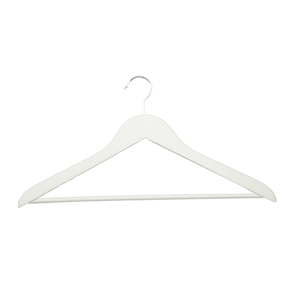 Konfekciós vállfa, 2db-os szett Ívelt, lótuszfa, fehér színű gumírozott festéssel, pantallótartóval Nikkelezett akasztóval Minden kényes ruhaneműhöz ajánlott csúszásmentes felület Mérete: 45 cm.