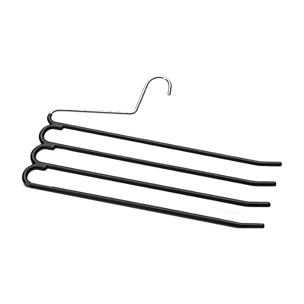 Fekete csúszásmentes műanyagbevonatú acél nadrágvállfa 4 nadrág tárolására. Extra erős kivitel. Mérete: 34 cm.