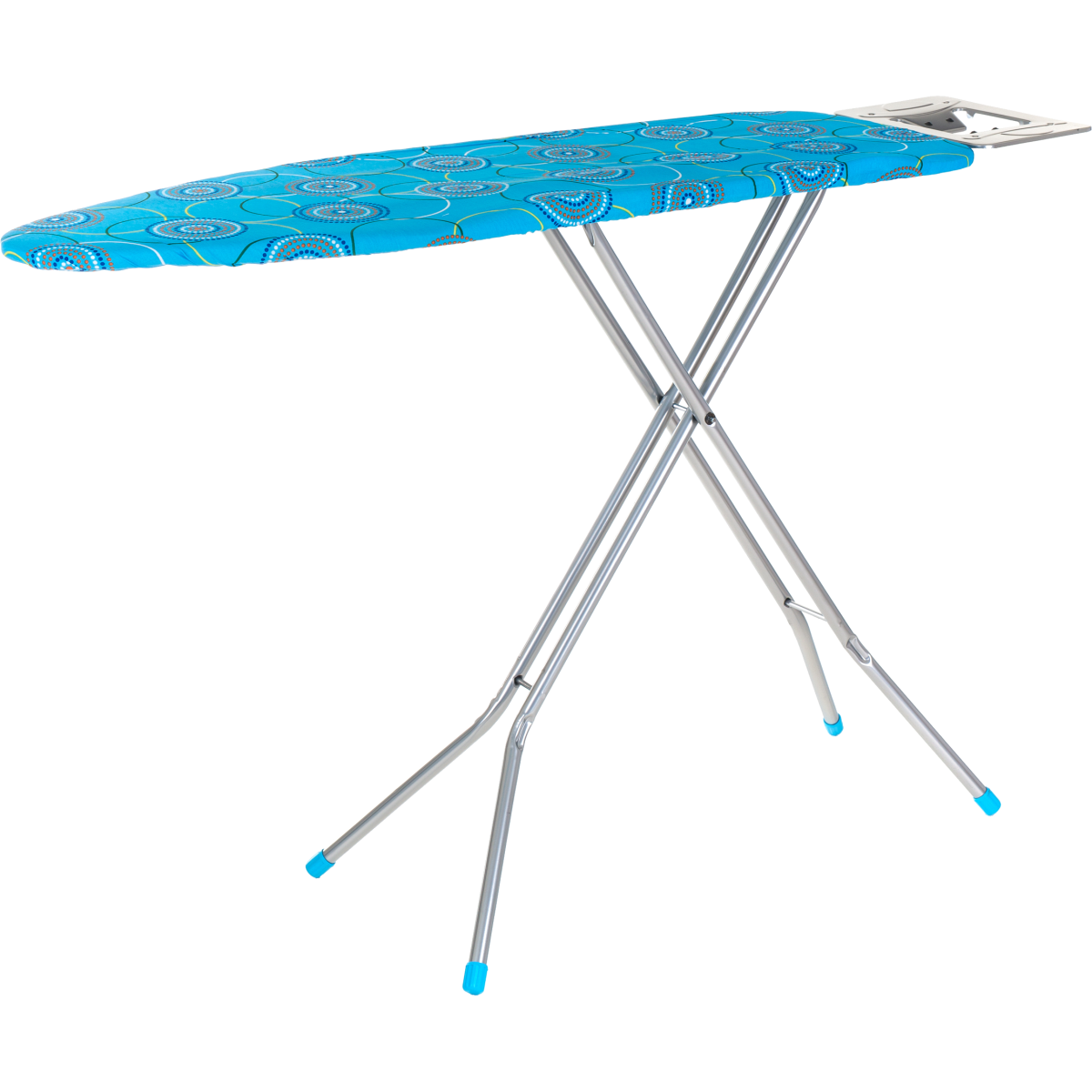 120x38cm méretű BLANCA vasalódeszka 29x20 cm nagyságú vasalólerakó fém felülettel. 70-90 cm állítható magasságban, hét szinten állítható, ezüst színű vázzal.