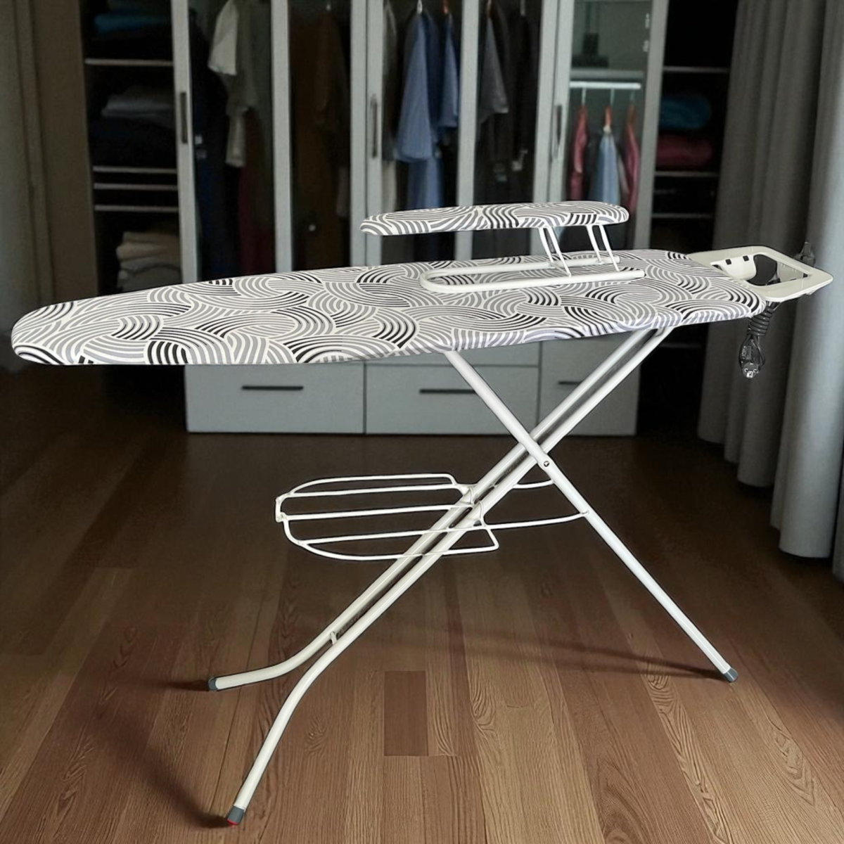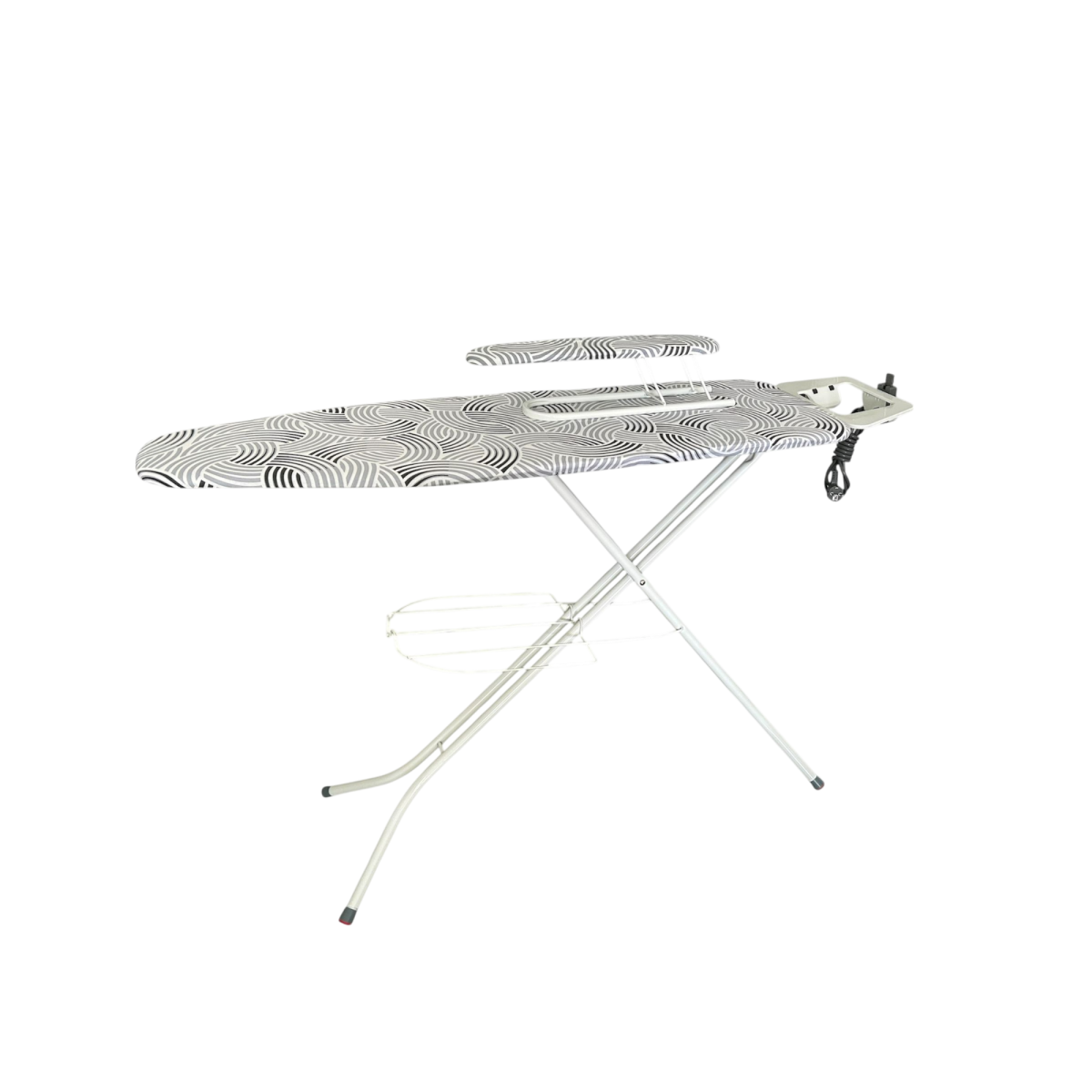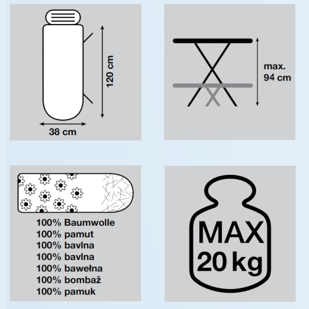 Elektromos vasalóállvány ujjvasalóval, mérete: 120x38cm, magassága: 94cm, 190cm-es kábelhossz, mosható pamut huzattal.
