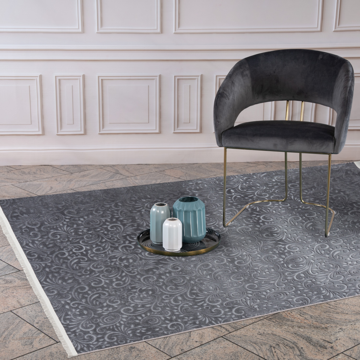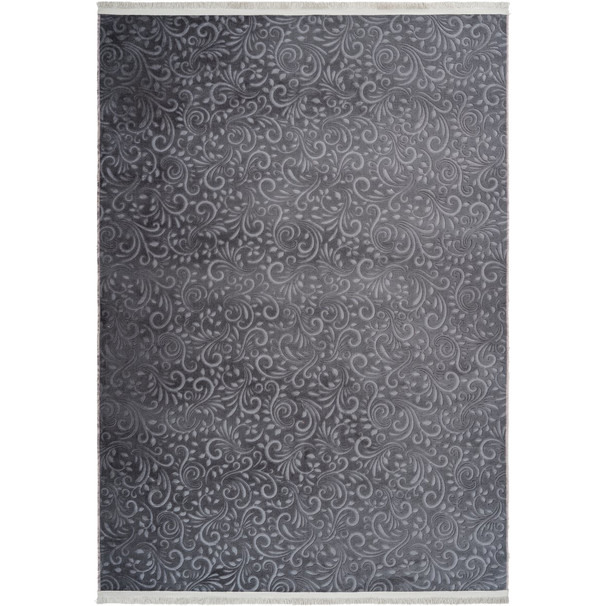 Peri inda mintás, nyomtatásos módszerrel készült, rojtos szőnyeg grafitszürke színben, 160x220 cm méretben.