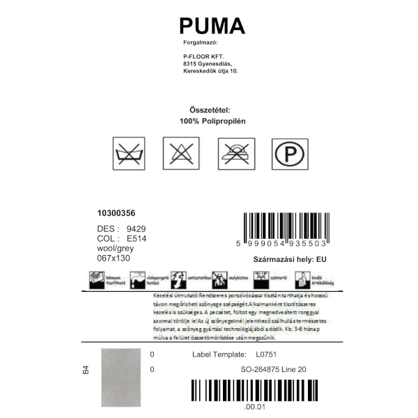 Elegáns világos minták és kifinomult mintázat jellemzi a Puma szőnyegeket. Rendkívül erős, vékony pálcás szőnyeg, előterekbe, étkezőkbe konyhákba ideális választás lehet. Vastagság kb. 4-5mm, összetétel 100% PP, összsúly kb. 1500gr/m2.
