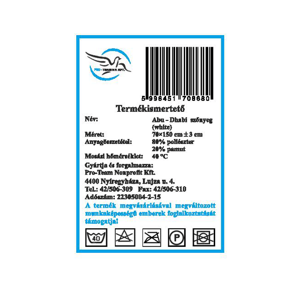 PRO TEAM SZŐNYEG 70X150 FEHÉR