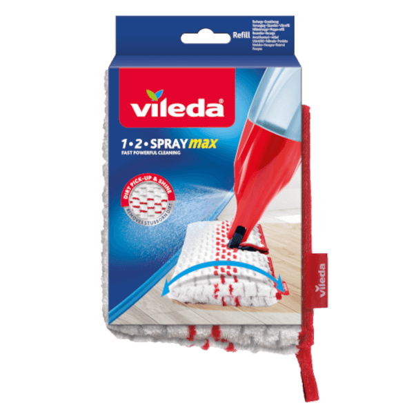 Vileda 1-2 Spray Max utántöltő felmosófej. 2 az 1-ben mikroszálai hozzájárulnak az alaposabb tisztítási teljesítményhez. A fenntarthatóság jegyében az utántöltő a használatot követően mosógépben mosható.