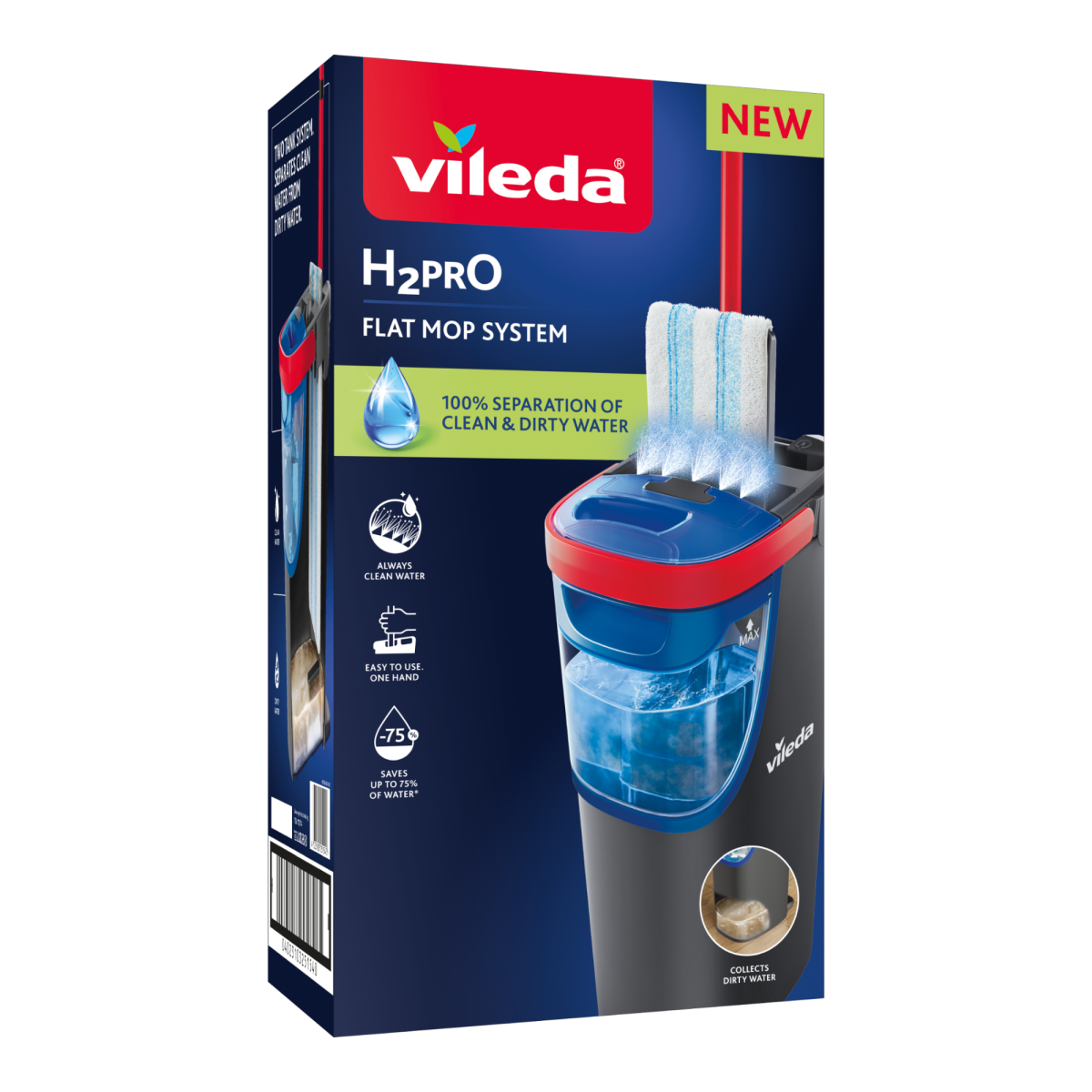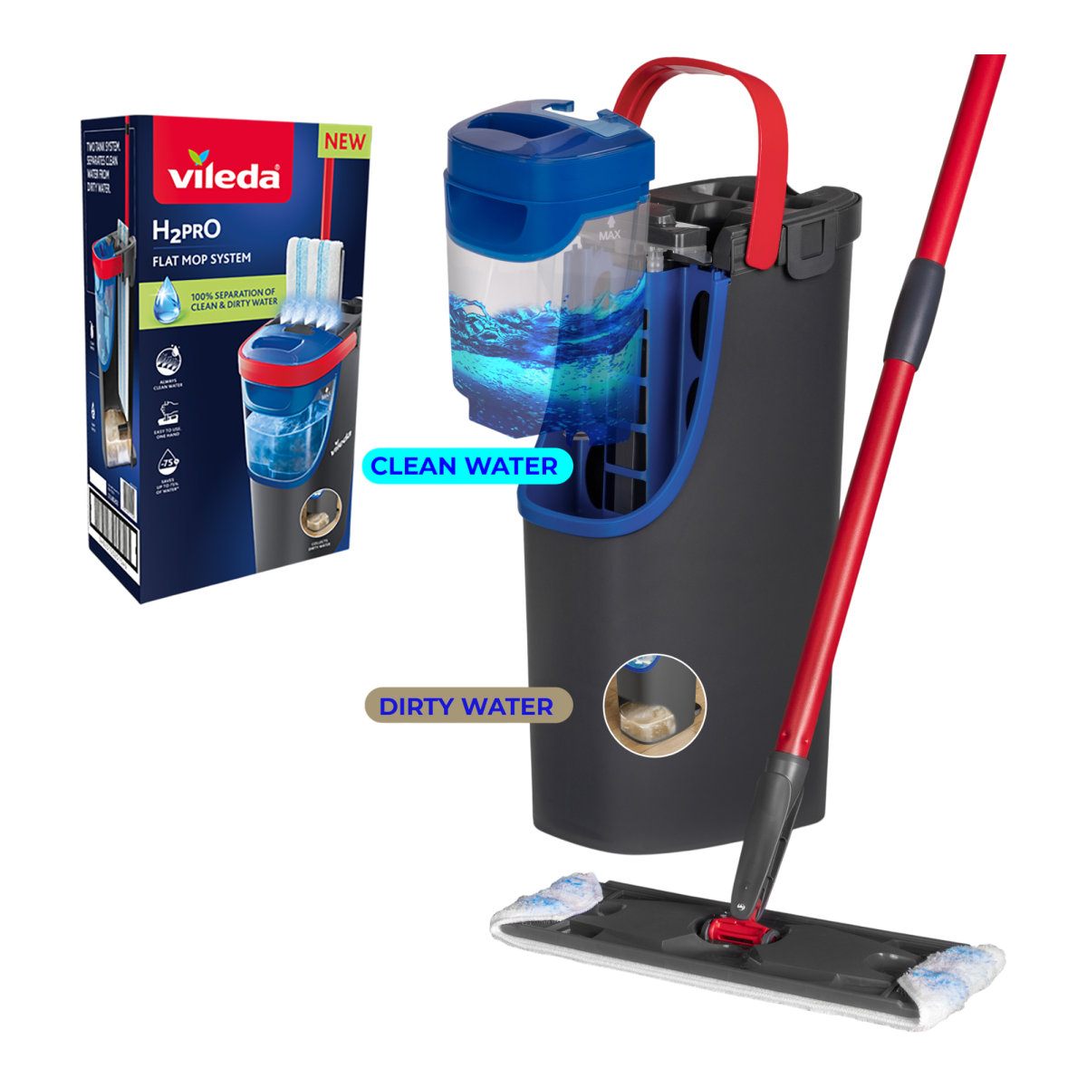 A Vileda H2PrO lapos felmosó szett új szintre emeli az otthoni padlótisztítást. A két tartályos rendszernek köszönhetően külön kezeli a tiszta és a szennyezett vizet, így mindig friss vízzel moshatod fel a padlót.