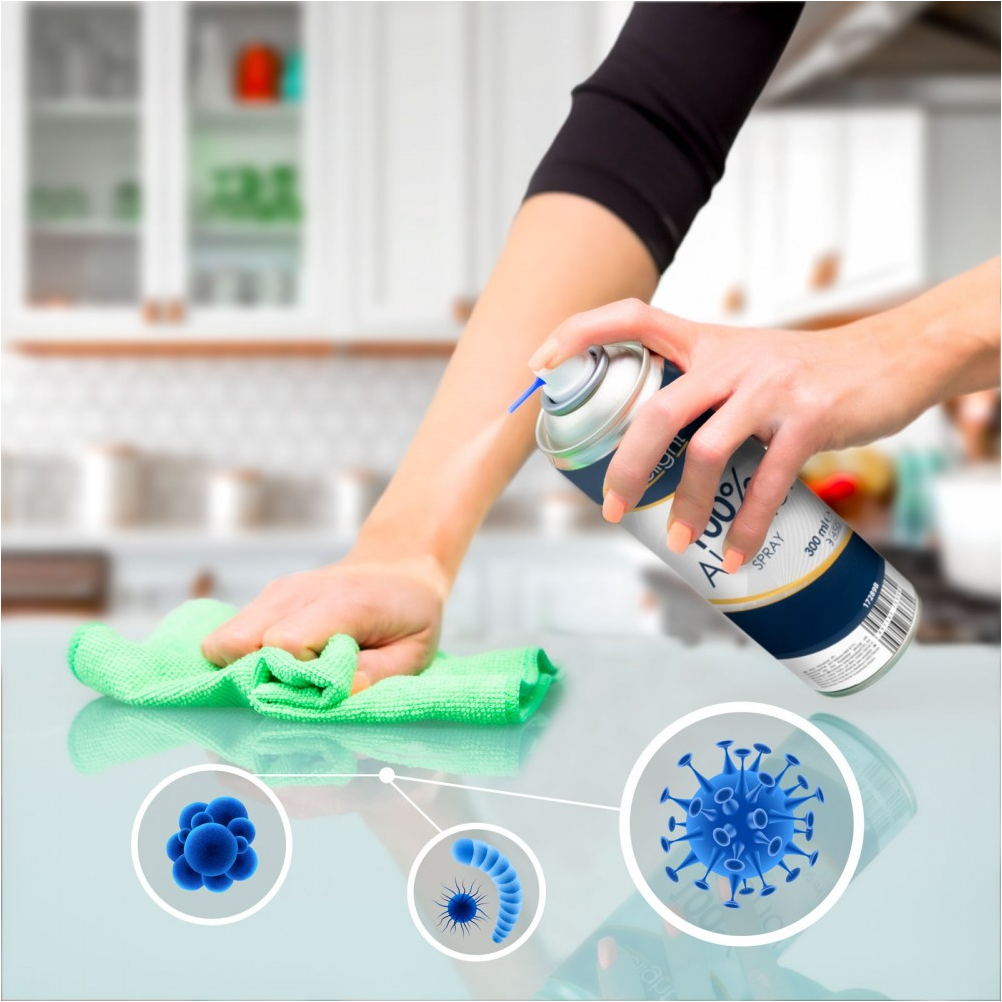 A termék felület fertőtlenítésre használható - ebben az időszakban különösen fontos a környezetünk, napi használati tárgyaink fertőtlenítése pl. mobiltelefonok, kulcsok, ajtó kilincsek, autó belső műanyag felületei, elektronikai eszközeink - laptop - számítógép billentyűzete, egér, bútorzat - asztal felülete stb. Használható továbbá a vásárolt élelmiszerek csomagolásainak fertőtlenítésére is. A termék 100% alkohol mely a felületre fújást követően gyorsan elpárolog, nem hagy foltot maga után. Plazma TV-n, LCD, LED, TFT kijelző felületeken ne használja!