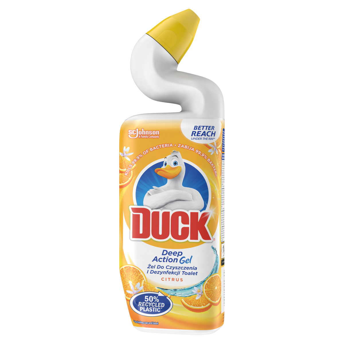 A citrus illatú Duck Deep Action fertőtlenítő WC-tisztító gél megöli a baktériumok 99,9 %-át. Különleges, ívelt nyakának köszönhetően a perem alatti rész is könnyedén elérhető, tisztaságot és friss illatot biztosít a toalettben.