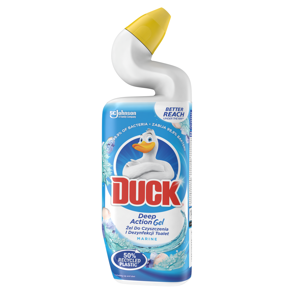 Duck wc-tisztítószer flakonja, ívelt nyakával könnyedén eléri a wc csésze pereme alatt meghúzódó baktériumtenyészetet. A mellékhelyiségben friss óceán illatot és vízkőmentes tisztaságot varázsol.