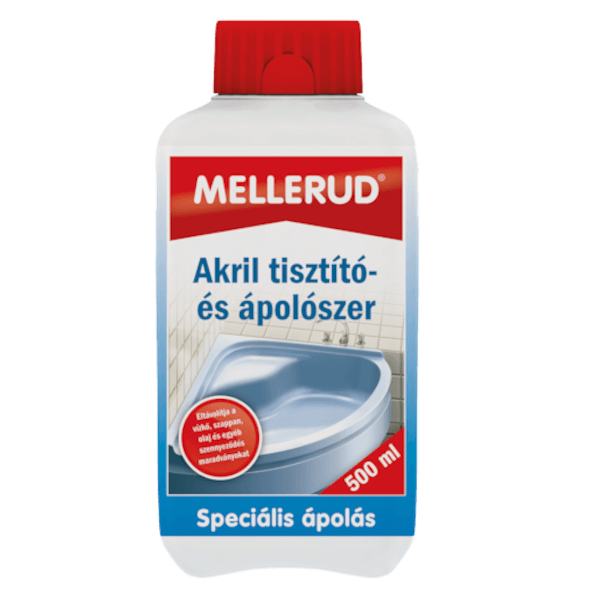 Mellerud akriltisztító és -ápoló, 0,5 l, akril, szintetikus és krómfelületekre, rozsdamentes acél szerelvényekre, alkalmas vízkő, szappan, olaj és egyéb szennyeződések eltávolítására. Megakadályozza a por és piszok lerakódását, fényes, vízlepergető réteget képez, antisztatikus hatású.