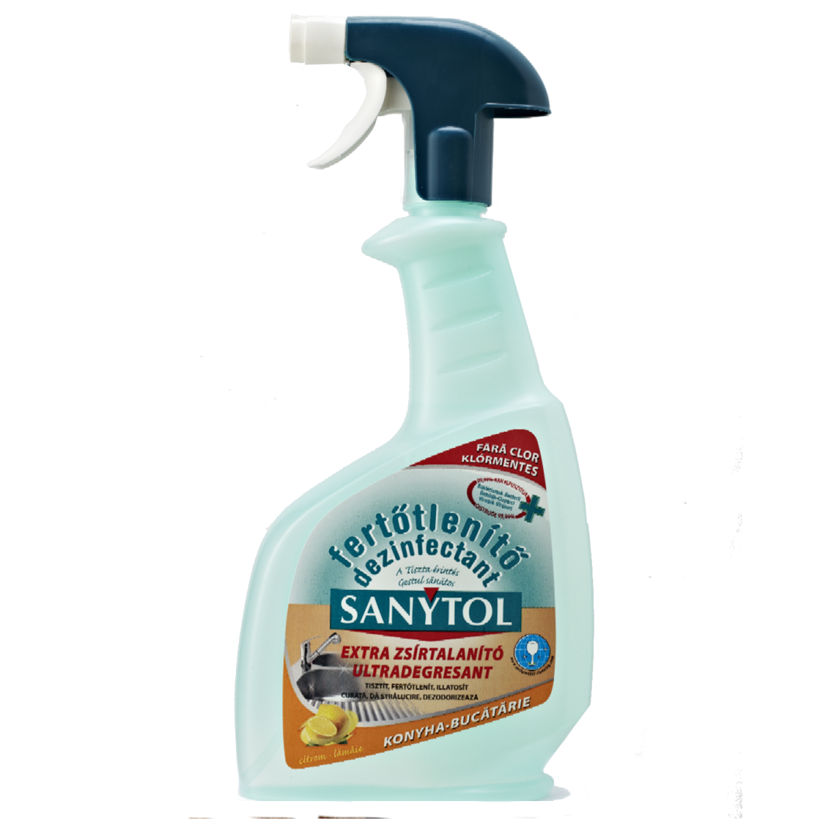 Sanytol konyhai fertőtlenítő tisztító spray - 500ml - extra zsíroldó hatású fertőtlenítő tisztítószer - klórmentes. - hármas hatás: 99,99%-ban eltünteti a vírusokat, bartériumokat és a gombákat - alaposan fertőtlenít és zsírtalanít - kíméletes a felületekhez, kellemes citrom illatú.