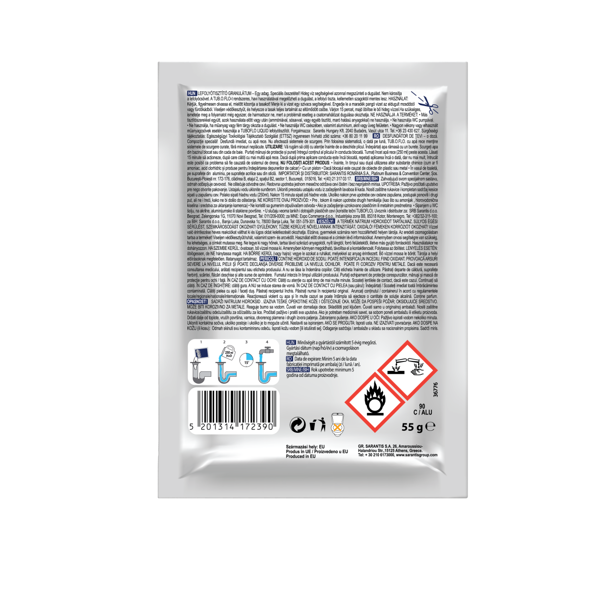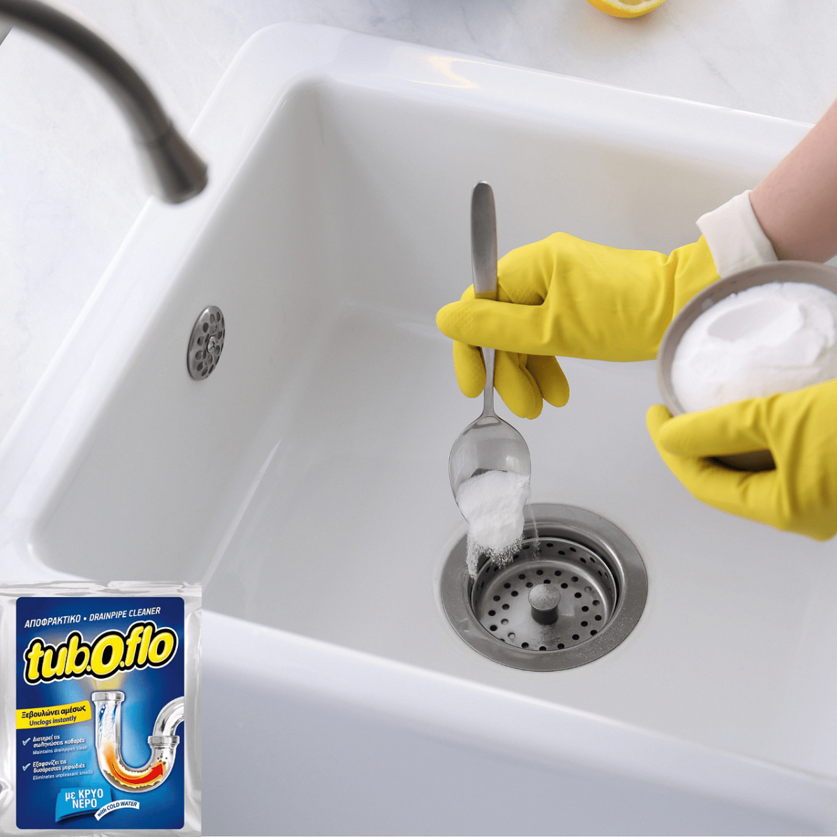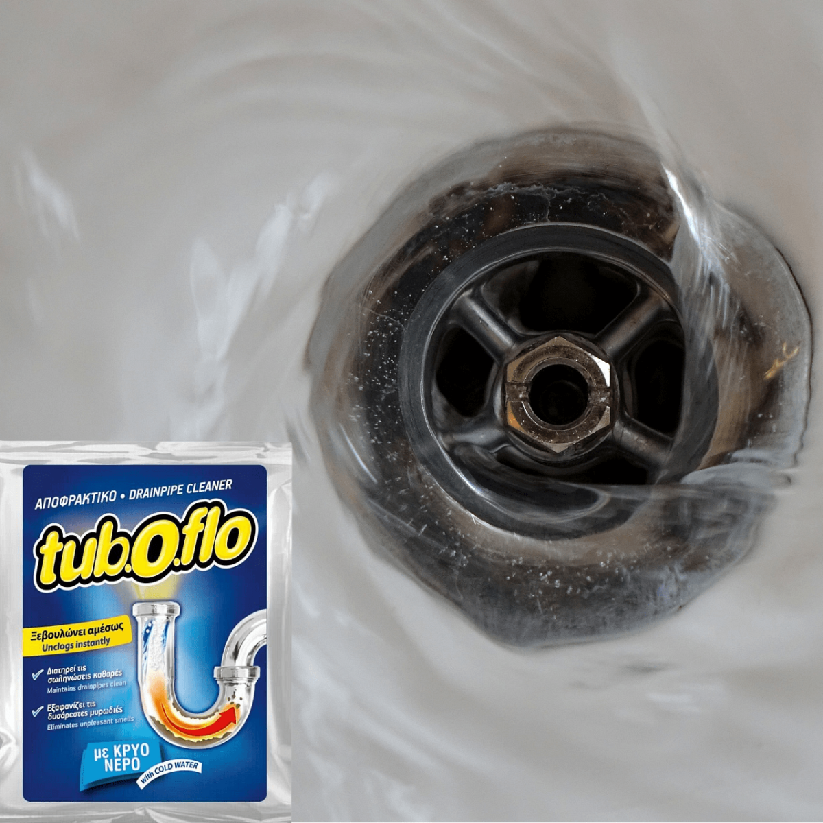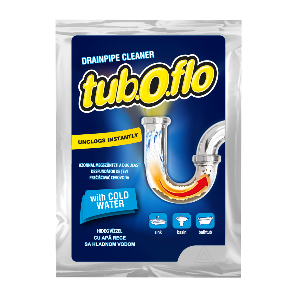 TUB-O-FLO hideg vizes lefolyótisztító granulátum. Könnyű és gyors használat. Antibakteriális összetevői megszüntetik a rossz szagokat és védik a csövet. Kis kiszerelés, praktikus, takarékos megoldás.
