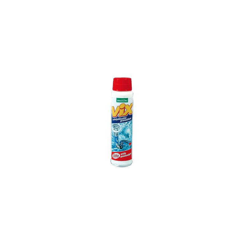 Vix lefolyótisztító granulátum, 500g. A Vix lefolyótisztító granulátum szennyvízelvezető csövek és lefolyók tisztítására, fertőtlenítésére, valamint dugulás elhárítására alkalmas. A szifonok, lefolyók beszűkült nyílásait, dugulásait megszünteti, fellazítja, vízoldhatóvá teszi. Extra erős, extra gazdaságos!