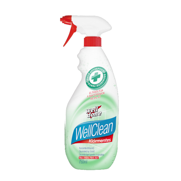 Well Clean felületfertőtlenítő. Kiszerelés: 750ML. Tisztítóhatását az egész lakásban kifejti, miközben tökéletes higiéniát biztosít, eltávolítja a nemkívánatos mikroorganizmusok 99,9%-át. Alkalmazás: biocid termék 2. és 4. terméktípus; felületfertőtlenítő szer, kombinált hatású. Betegellátó- és közintézményekben, háztartásokban, fürdőszobákban, konyhákban, vendéglátóiparban, élelmiszer-előállító helyeken mosható burkolatok, szaniterek, berendezési és felszerelési tárgyak felületeinek egy munkafázisban történő tisztító hatású fertőtlenítése. Formuláció: felhasználásra kész oldat. Antimikrobiális spektrum: baktericid, MRSA, fungicid, szelektív virucid.