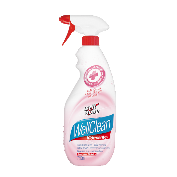 Well CLEAN fertőtlenítő hideg zsíroldó. Tisztítóhatását hatékonyan fejti ki a zsíros felületeken, miközben tökéletes higiéniát biztosít, eltávolítja a nemkívánatos mikroorganizmusok 99,9%-át. Formuláció típusa: oldat, felhasználásra kész oldat. Alkalmazás: kombinált hatású biocid termék (2. és 4. terméktípus); tisztít és fertőtlenít egy lépésben. Betegellátó- és közintézményekben, konyhákban, vendéglátóhelyeken, közétkeztetésben, élelmiszeriparban erősen szennyezett, zsíros felületek és berendezési, felszerelési tárgyak felületeinek egy munkafázisban történő tisztítása és fertőtlenítése. Formuláció tipusa: Oldat, felhasználásra kész oldat. Antimikrobiális spektrum: baktericid, fungicid, virucid.