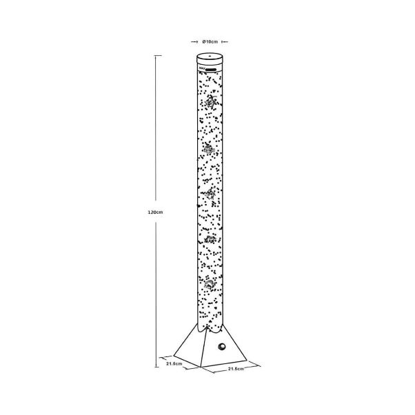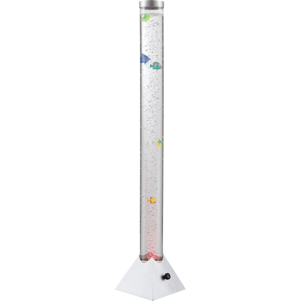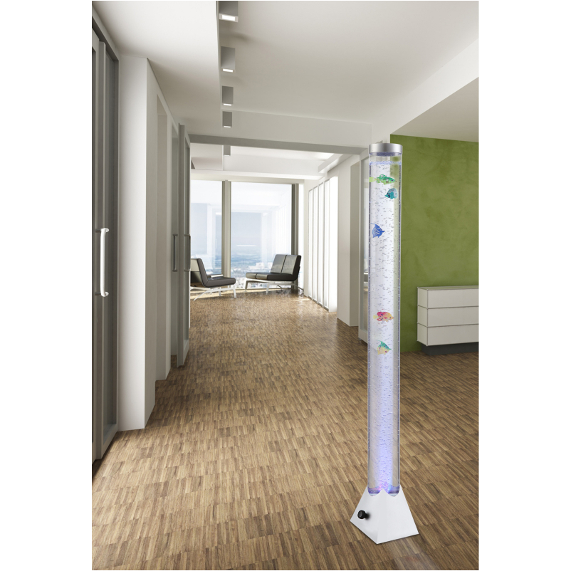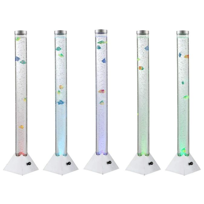 Mendosa vízoszlop formájú állólámpa; 0,06W, 12V, 12 RGB LED-es, így különböző színekben tündökölhet lakásában. Halacskák úszkálnak a buborékok között. A tartó aljzat szürke műanyag, az akvárium cső átlátszó műanyag.