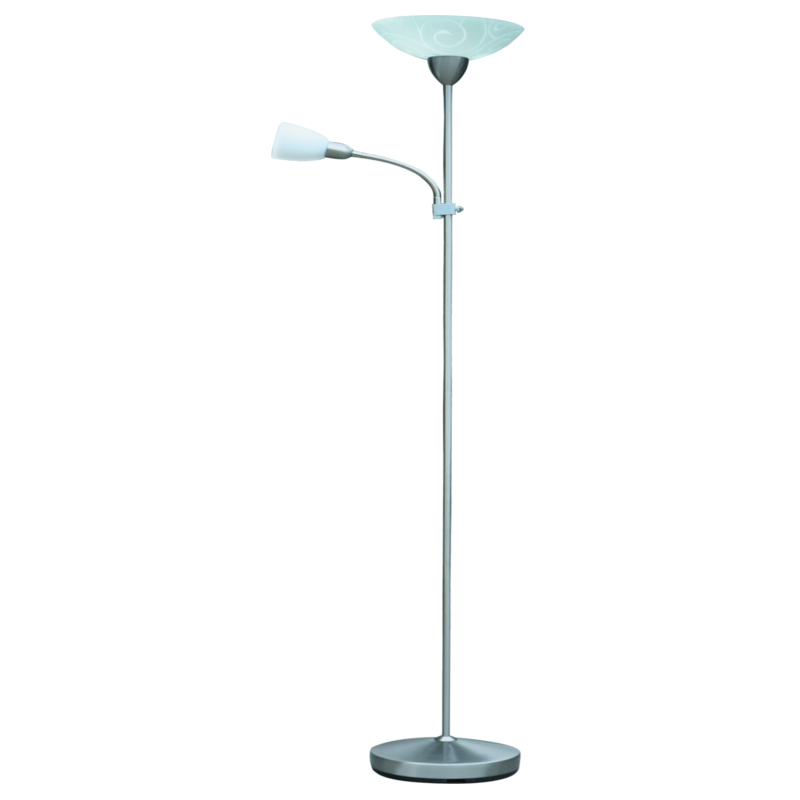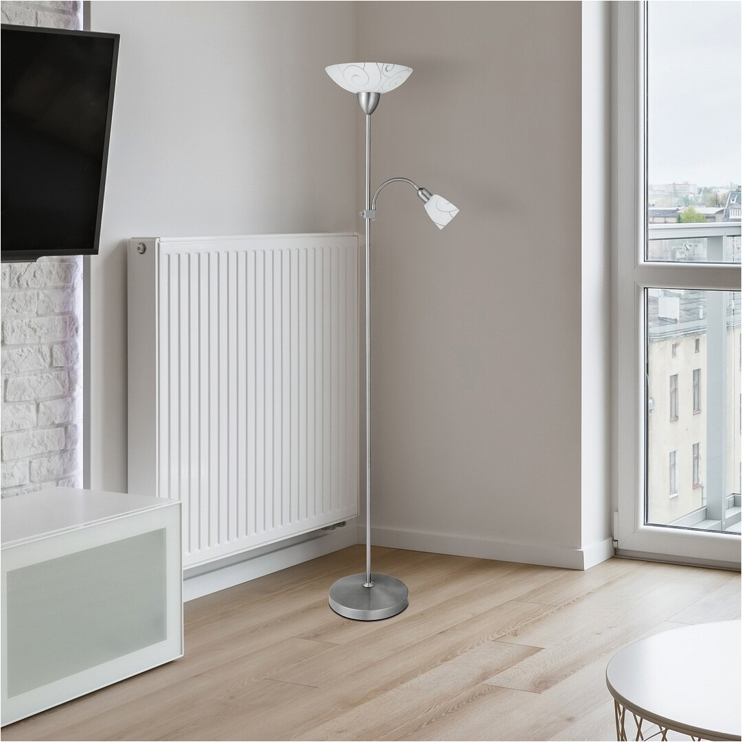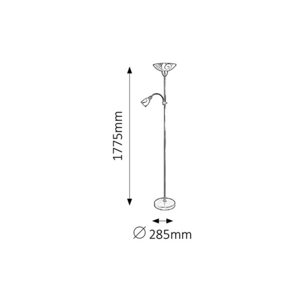 Állólámpa külön kapcsolható olvasókarral, 177.5 cm-es magas szatin króm színű fém szerkezet, fehér alapszínű, szürke inda mintás üvegbúrákkal. Az állólámpa felső lámpateste E27-es foglalatban maximum 100W teljesítményű, olvasókarja E14-es foglalatban maximum 40W teljesítményű kompakt és energiatakarékos LED fényforrással is üzemeltethető. Kialakításának köszönhetően a fényforrások cseréje és a lámpatest tisztítása könnyen és egyszerűen elvégezhető. Falikapcsolóval 3 lépésben lehet a fényerőt szabályozni.