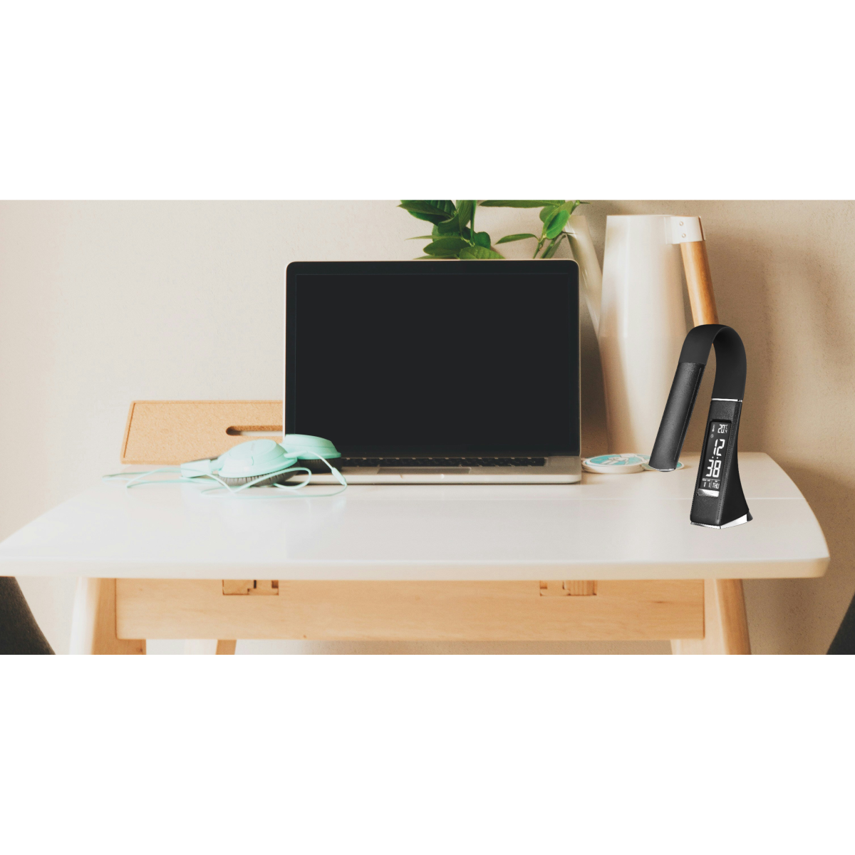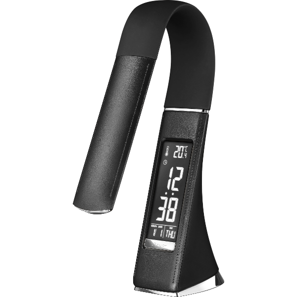 Sophie LED asztali lámpa fekete színben, 6,5W 240LM 35.000 óra élettartam óra, hőmérséklet és naptár funkció, érintõkapcsolóval szabályozható fényerő, beépített fényforrás (nem cserélhető).