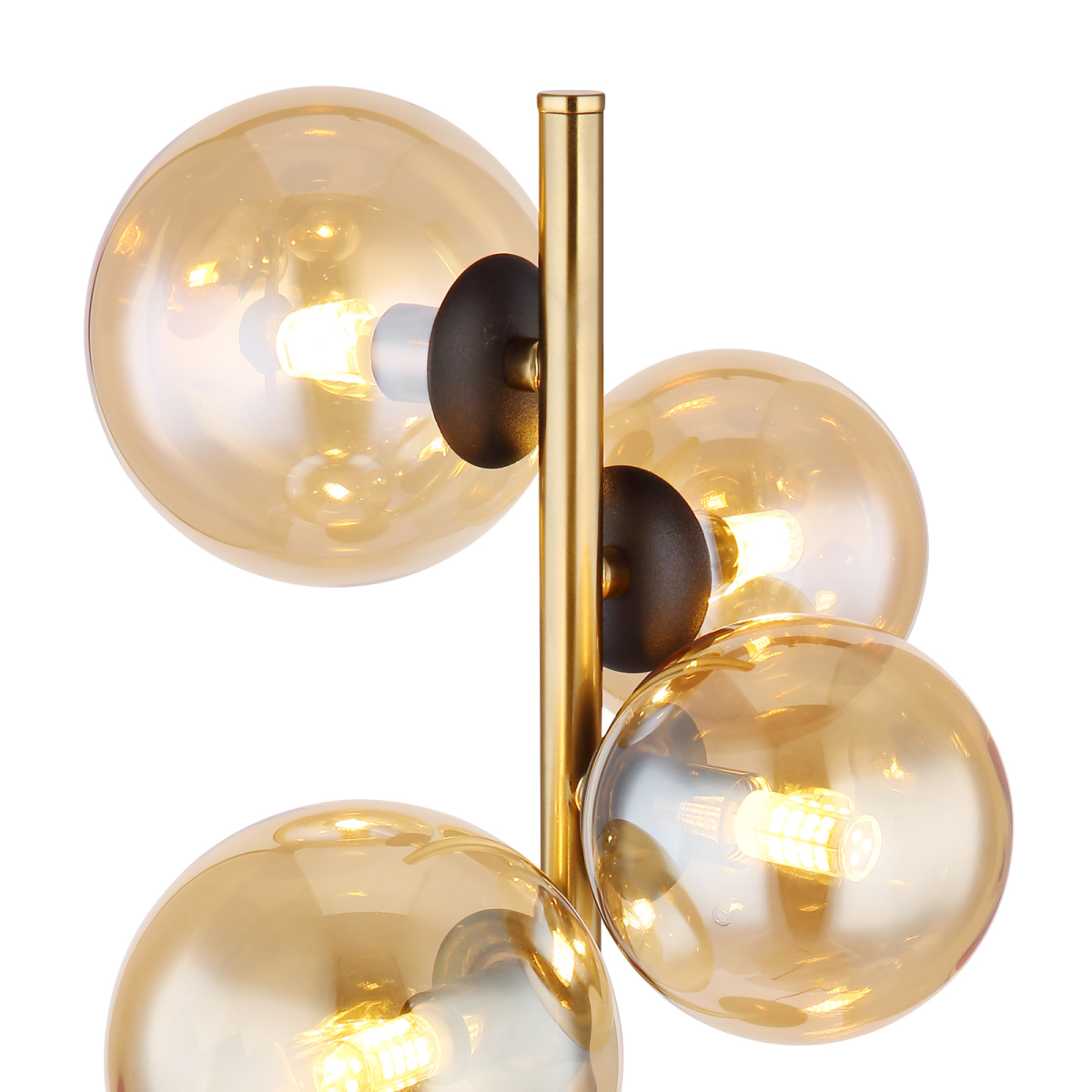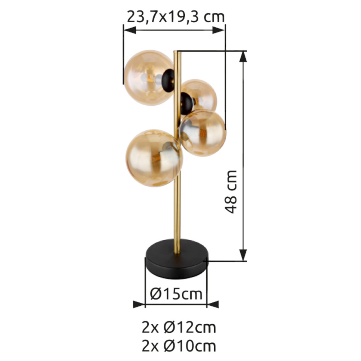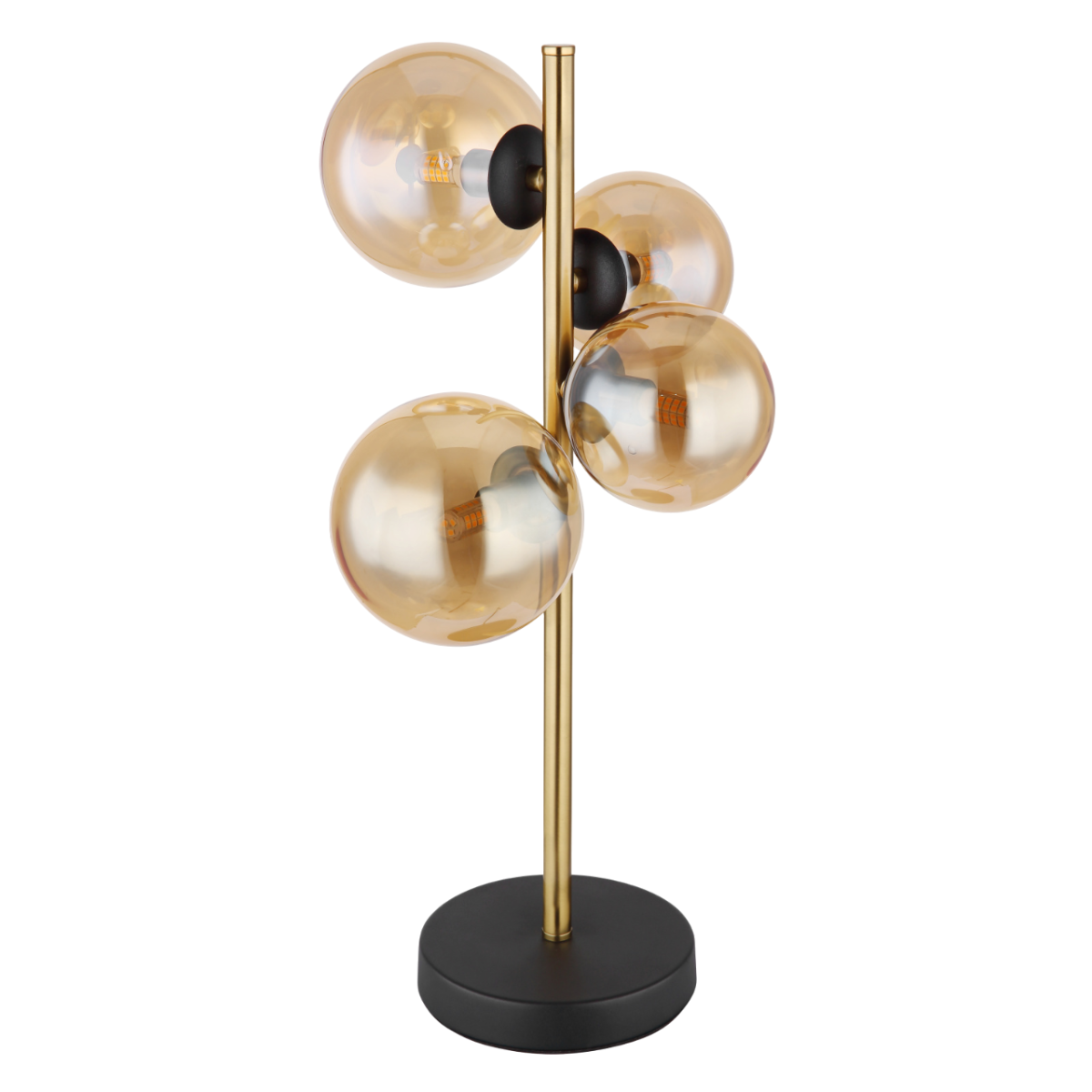 Ez a lenyűgöző asztali lámpa a Riha család tagja. Kerek fekete matt alaplapból egy 48 cm-es, gyönyörű sárgaréz színű fémrúd emelkedik ki, rajtra négy darab G9-es foglalatú LED fényforrással, amelyeket különböző méretű borostyánsárga színű üvegbúrák ölelnek körbe. A fényforrás 3000 Kelvin meleg fehér fényt bocsát ki, így kellemes légkört teremt.