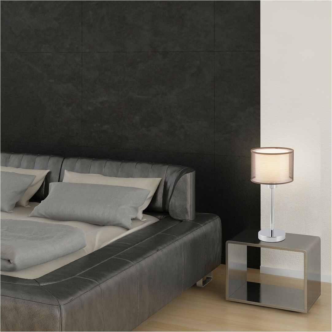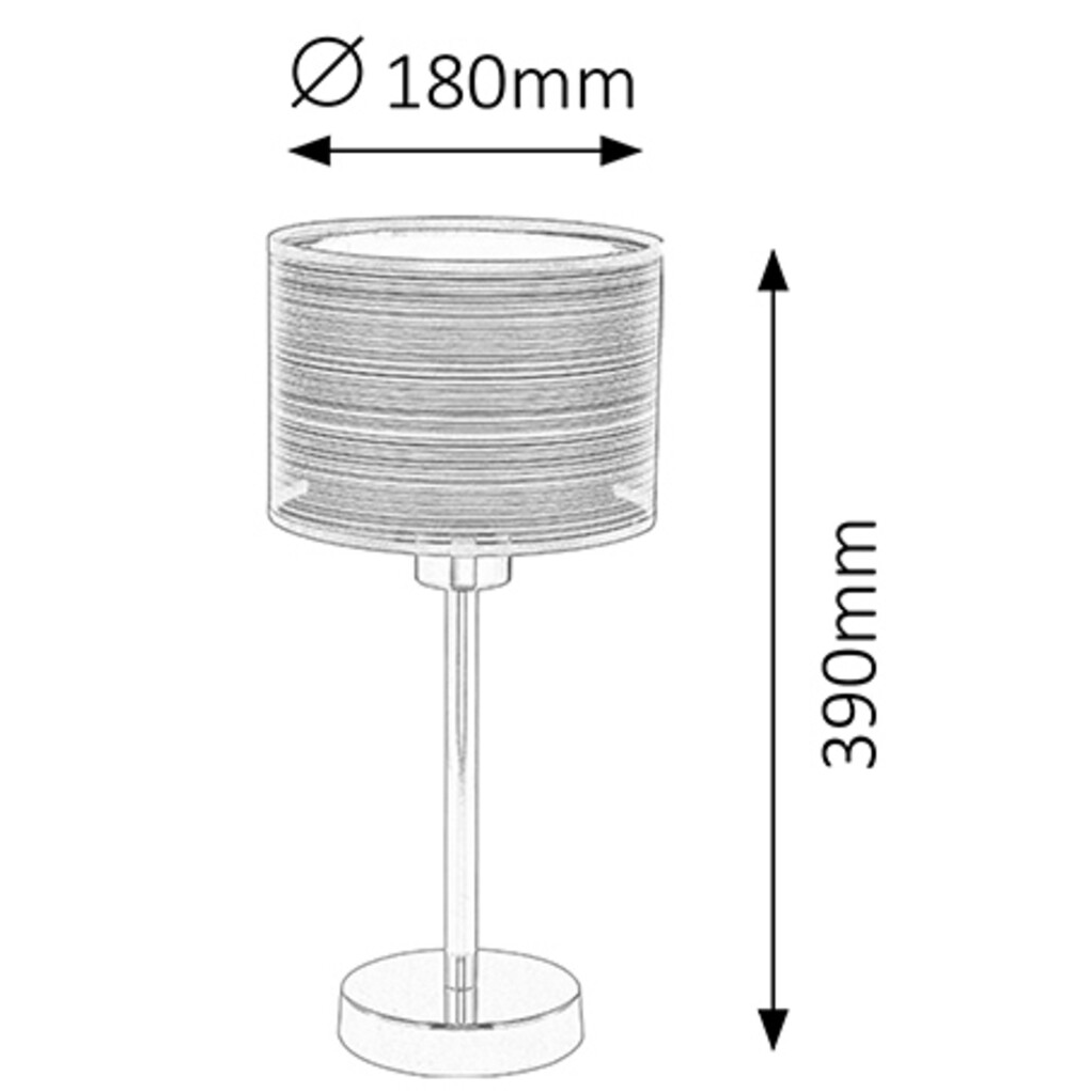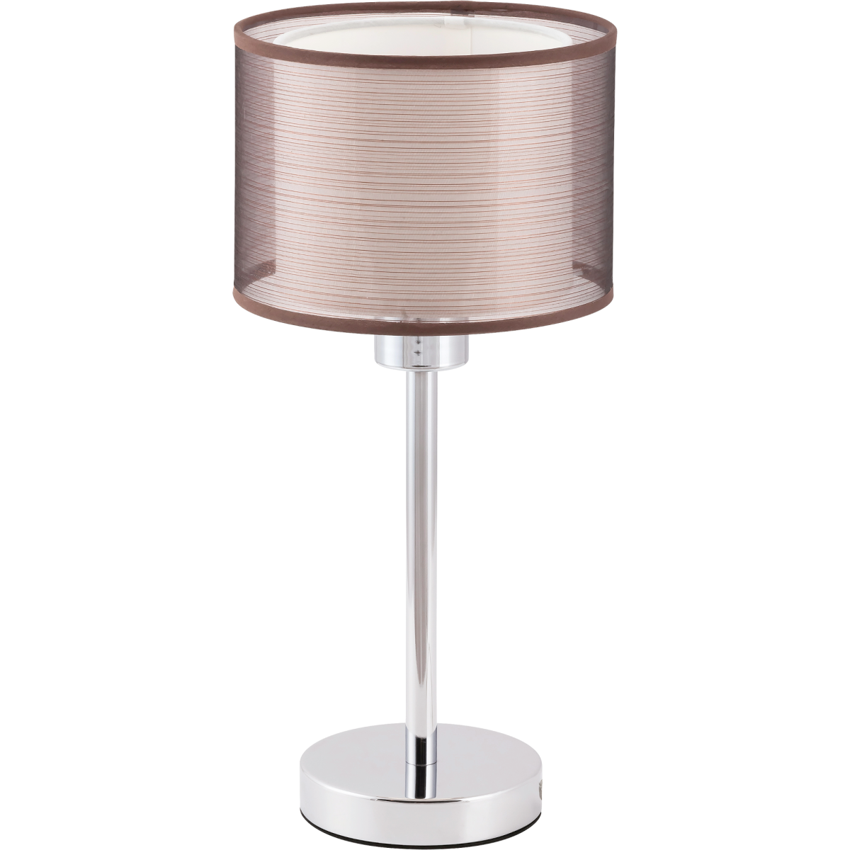 Időtlen megjelenésű asztali lámpa 1 db foglalattal, vezetékes kapcsolóval. 39 cm magas, króm színű fém lámpatest, valamint barna és fehér színkombinációjú, 18 cm átmérőjű textil lámpabúra. Az asztali lámpa E27-es foglalatú, maximum 60W teljesítményű fényforrással használható.