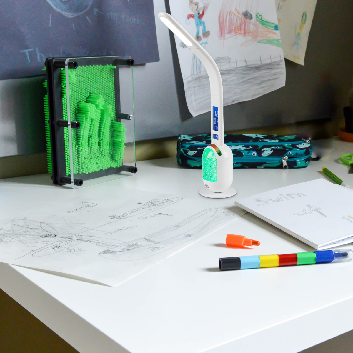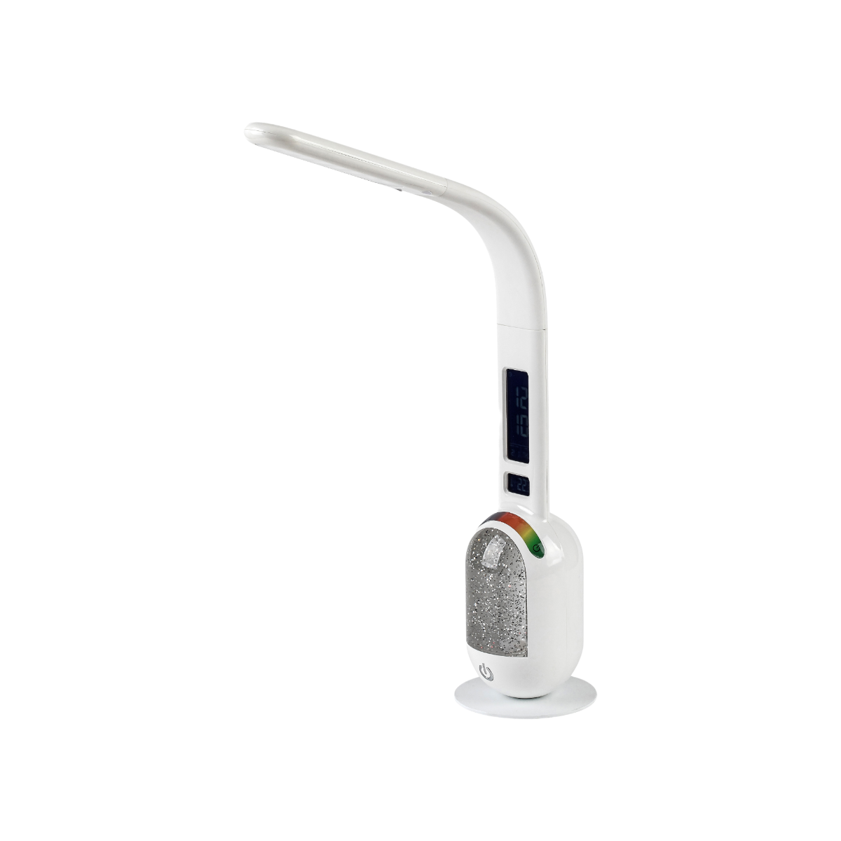 A Figen asztali lámpát azoknak ajánljuk, akik a kiterjedt funkcionalitás mellett nagyra értékelik a dekoratív megjelenést is. Ez a modern lámpa teljes egészében műanyagból, elegáns fehér színben, korong alakú dísztalppal készül. Szára vékony és lapos, alsó részén két kijelzővel. A test dísztalppal érintkező, öblös része áramoltatható csillámos anyaggal van megtöltve – ez a rész külön kapcsolható. A lámpa RGB világításra képes, aminek köszönhetően a csillámos töltet a legkülönfélébb színekben pompázhat.
