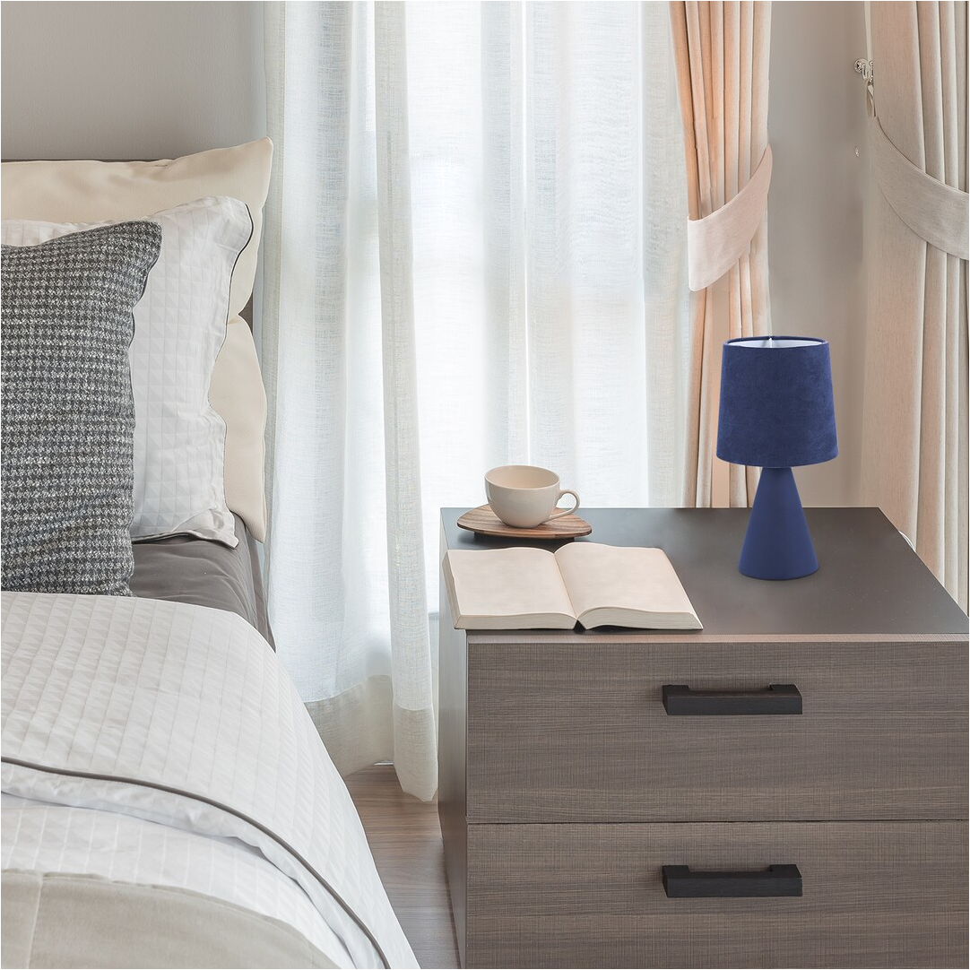 A kisméretű, megjelenésében melegséget sugárzó Nalani éjjeli lámpa helyet kaphat hálószobánkban, az éjjeliszekrényen vagy a nappaliban, egy alacsonyabb asztalon. A kerámiából készült, mélykék lámpatestet ugyanilyen színű, bársonyos textil búra egészíti ki. A vastag búra éppen csak annyi fényt enged kiszűrődni a lámpa belsejéből, amennyi elengedhetetlen, ha éjszakai felébredésünk alkalmával szükségünk lenne egy kis világításra. A Nalani egy darab, legfeljebb 40 W teljesítményű fényforrással használható, a foglalat típusa E14. Választhatunk hozzá meleg vagy természetes fehér fényű fényforrást. Az éjjeli lámpa vezetékes kapcsolóval működtethető, a vezeték színe fekete. A Nalani magassága 250 mm, a búra átmérője 130 mm.