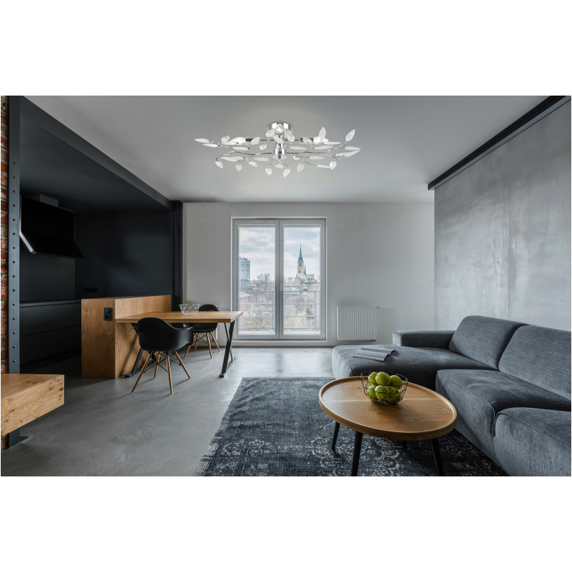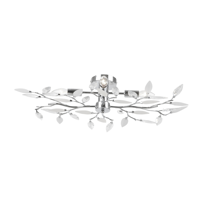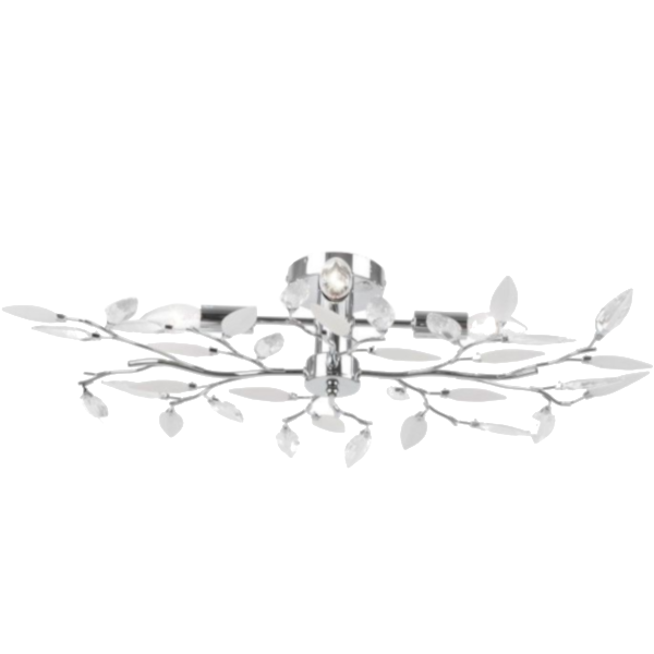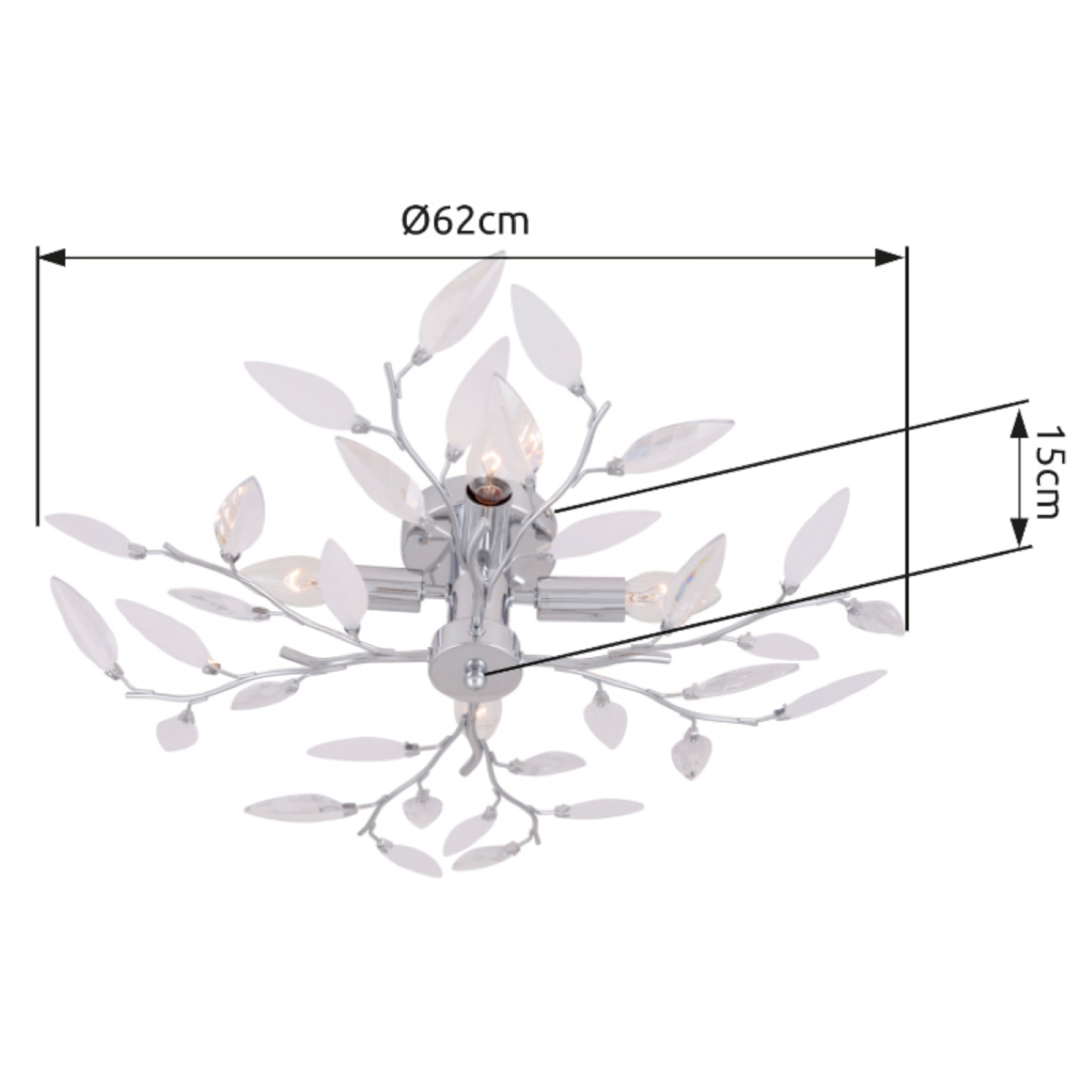 A króm alapra ágacskák vannak rögzítve, melyen homok fúvott és víztiszta akril levélkék találhatók. E14-es foglalattal rendelkezik, mely 4 db maximum 40W teljesítményű fényforrással üzemeltethető. Színe miatt igen sokféle stílusú helyiség világítása lehet, modern vagy klasszikus enteriőrbe egyaránt illeszkedik.