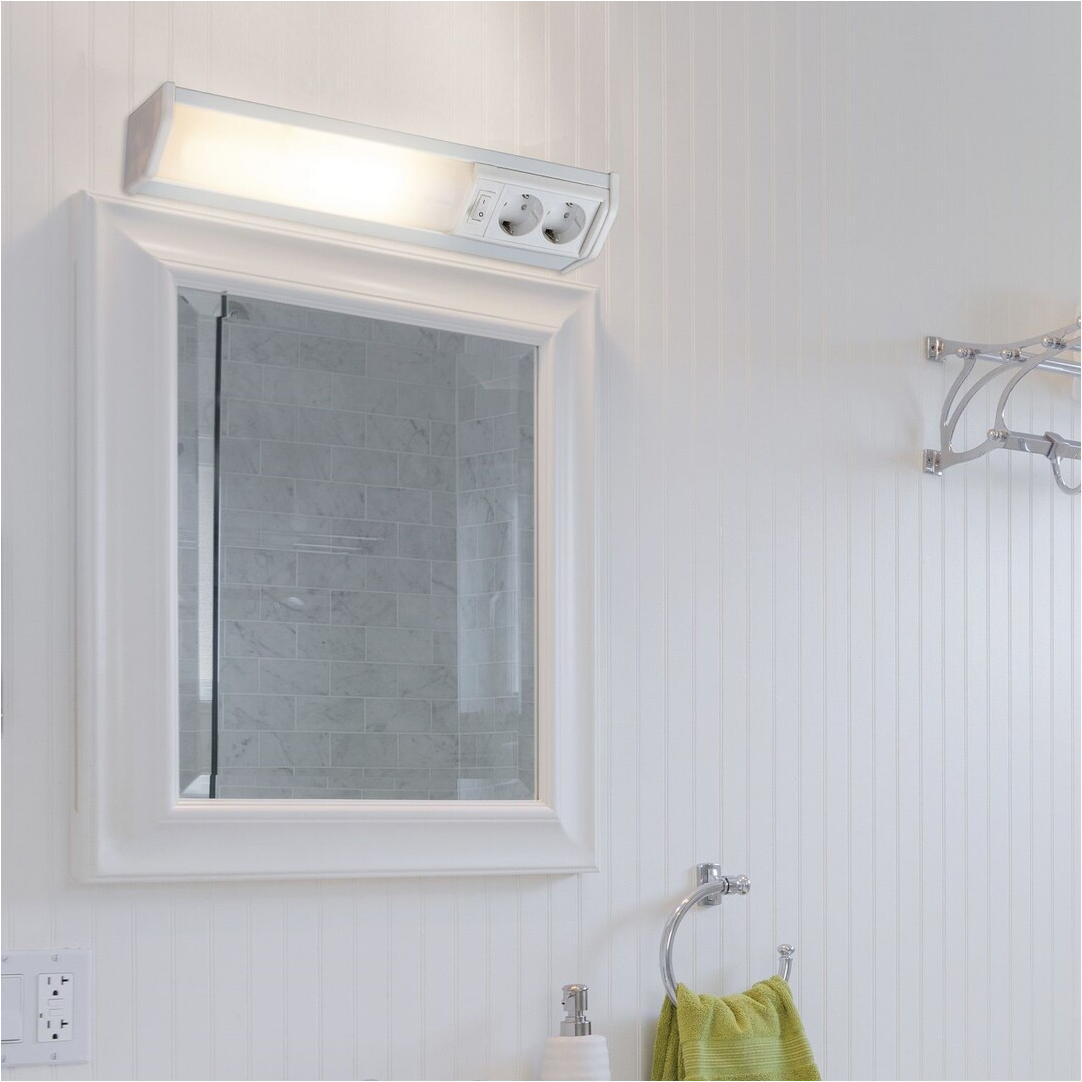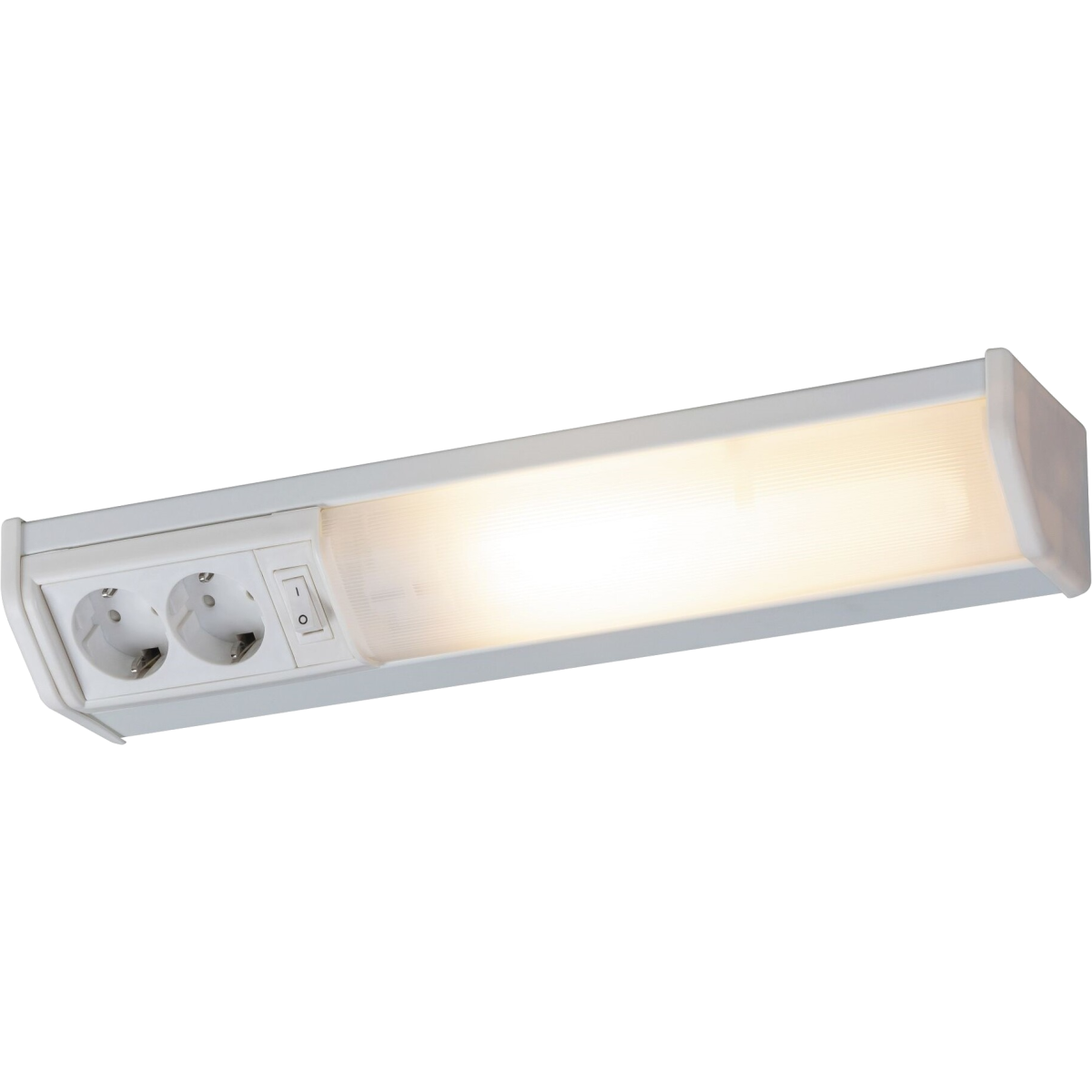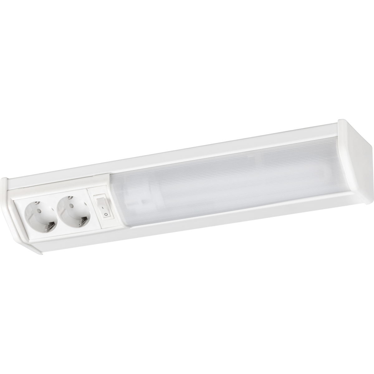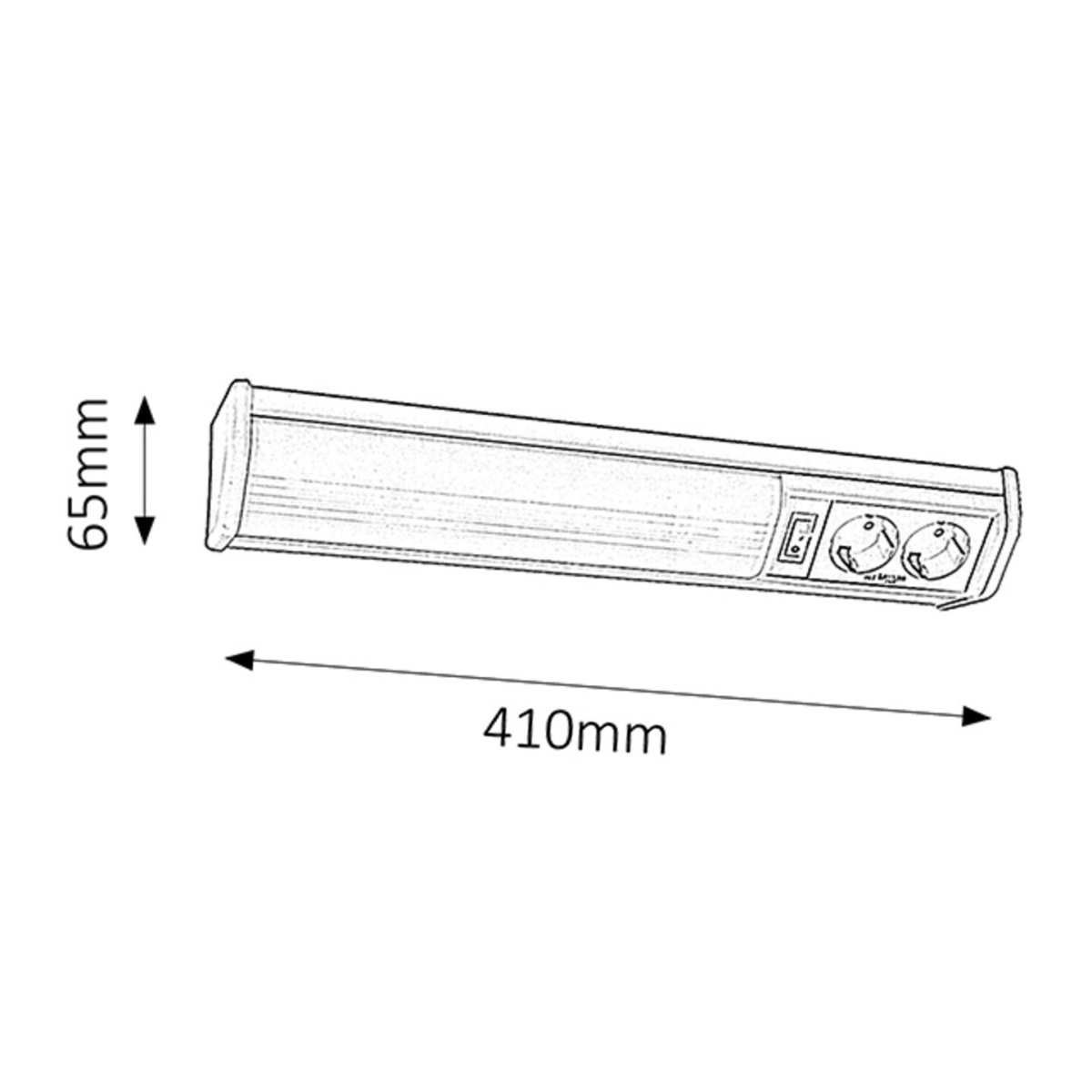 Modern megjelenésű fürdőszobai vagy pultmegvilágító lámpa. Egy darab energiatakarékos kompakt fénycsővel csomagolt, amely 11W-os, 840 lumen fényerejű, 2700 Kelvines, azaz melegfehér fényű. 65 mm magas, 410 mm széles fém és műanyag lámpatest fehér színű műanyag burával. Kapcsolós, egyszerűen kezelhető, 2 darab beépített hálózati csatlakozó aljzattal. Az IP20-as védettségű lámpa G23-as foglalattal készült, egy darab PL típusú, maximum 11W teljesítményű fényforrással használható.