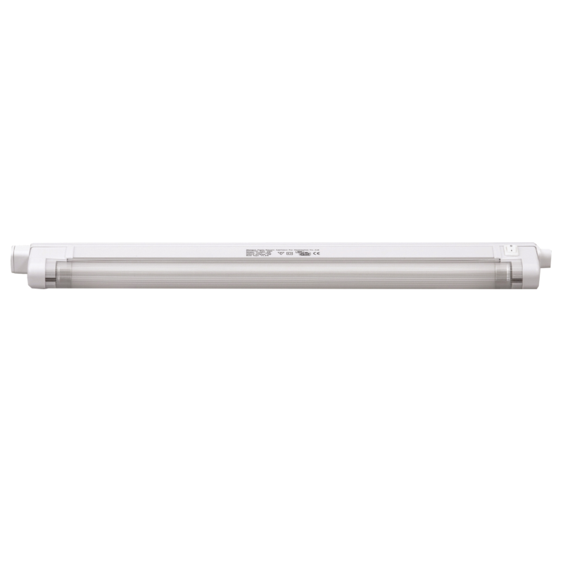 Slim fénycsöves lámpatest, fényforrással, kapcsolóval, soroló- és hálózati kábellel. Méret a faltól/plafontól 44 mm, súlya 0,3 kg.