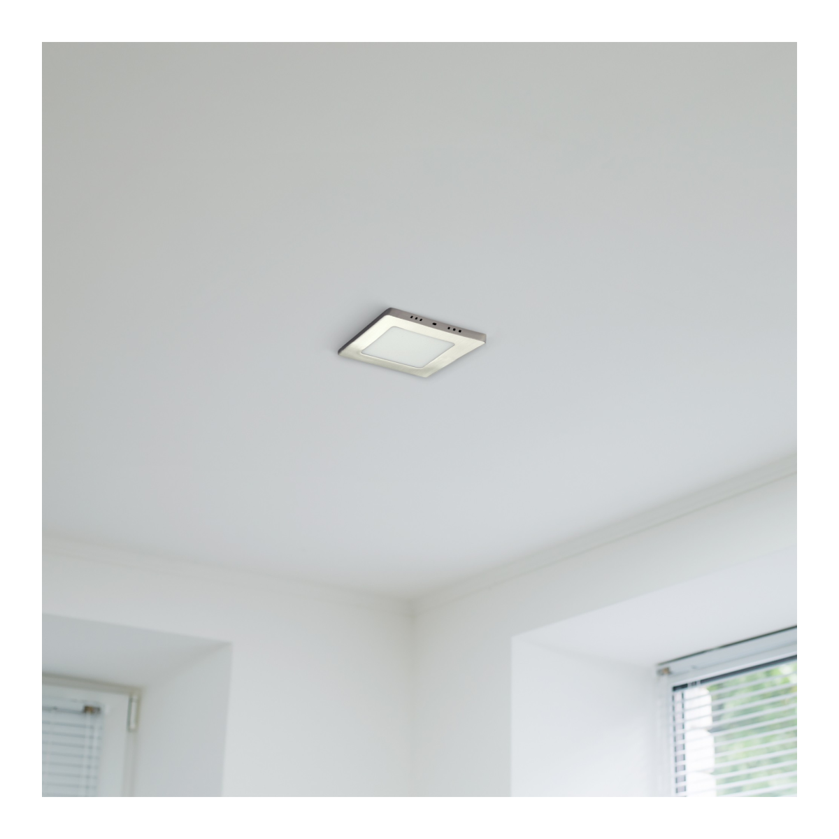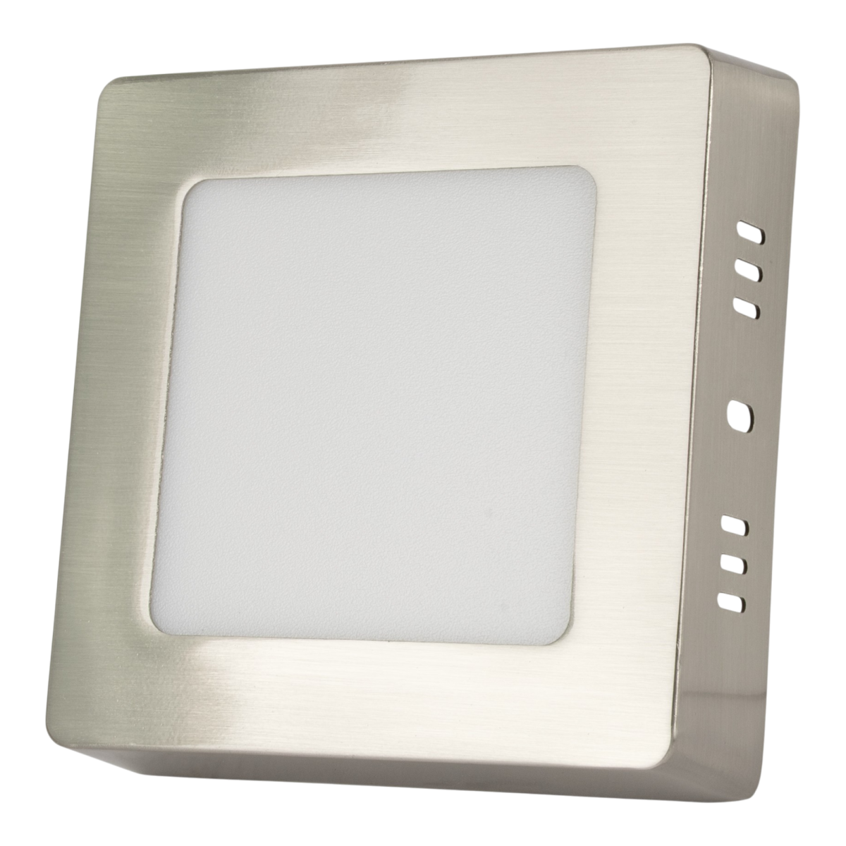 Négyzetes, falra vagy mennyezetre szerelhető LED-lámpa modern, alu szatén nikkel megjelenéssel. A 6 W teljesítmény kb. 420 lumen fényáramot ad; a természetes fehér (4000 K) fény kényelmes, mindennapi használatra alkalmas megvilágítást biztosít. A gyártói adat szerint akár 25 000 órás élettartamra tervezett, és kb. egy 36 W-os hagyományos izzót válthat ki.