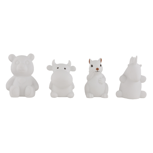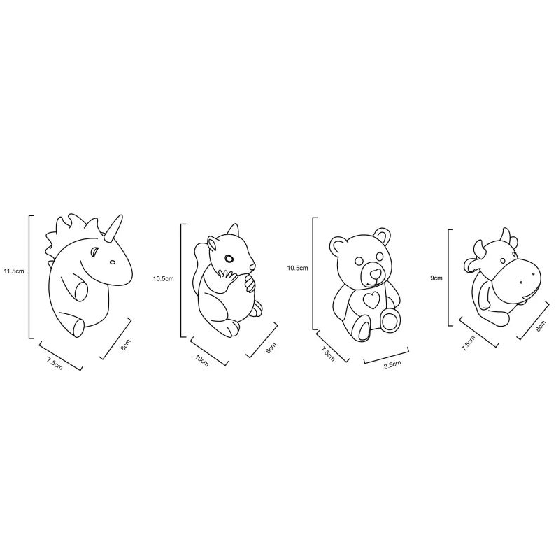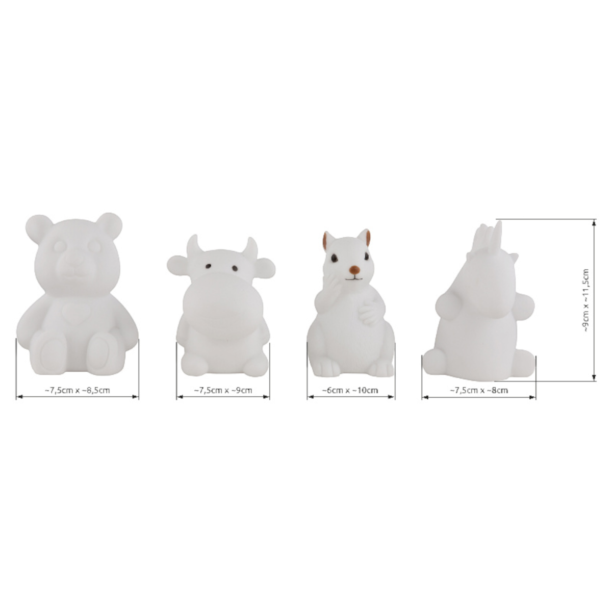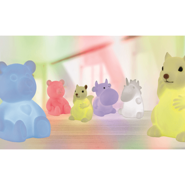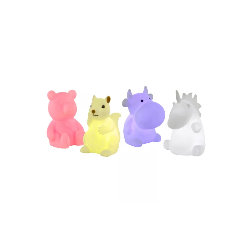 Színváltós asztali LED figura, maci, boci, mókus, egyszarvú; 1xRGB LED 0,06W 3V; 3xLR44 elemmel működik, mely tartozéka a terméknek.