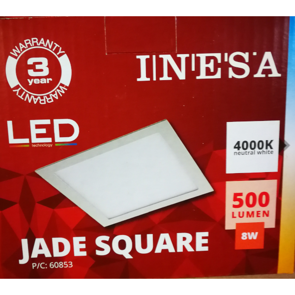 Jade beépíthető kocka panel 12x12 cm méretben, fehér színben; 8W, 500LM, 4000K, IP20.