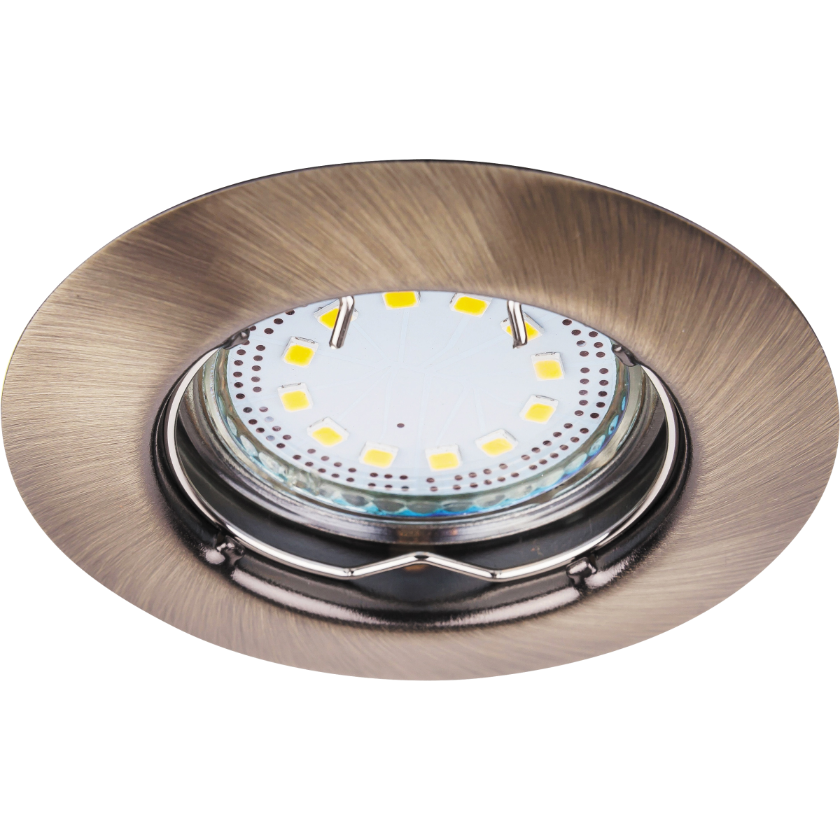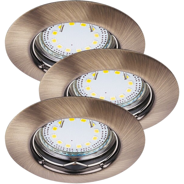 Gipszkarton álmennyezetbe, bútorlapba és polisztirol díszlécbe is beépíthető, modern megjelenésű 3 db-os LED spotlámpa szett, bronz színben. A spotok fix helyzetűek, egy állású megvilágítást biztosítanak. A 3x3W teljesítményű LED fényforrások 3x240 lumenes fényerőt biztosítanak, melegfehér (3000 Kelvin) színhőmérséklettel. A lámpa falba süllyesztett része IP40-es, a látható része pedig IP44-es védettséggel rendelkezik.