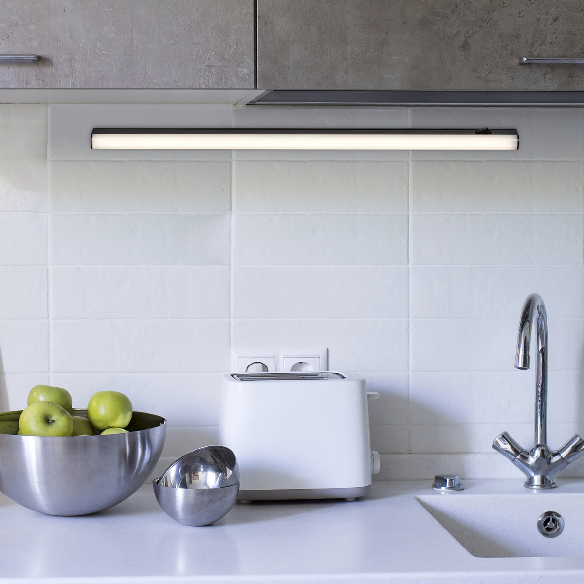 A modern stílusú Greg pultmegvilágító lámpa egyetlen konyhából sem hiányozhat. Az étkezések előkészítése, a mosogatás és a főzés során természetes fényével segíti a konyhában tevékenykedőket A fekete lámpatestet fehér búra egészíti ki, a lámpa anyaga teljes egészében műanyag. A Greg beépített LED fényforrással rendelkezik, amelynek a teljesítménye 13 W, fényereje búrával 1220 lumen, búra nélkül 1690 lumen, élettartama pedig 25 000 óra. A 4000 K színhőmérsékletű fényforrás természetes fehér fényt bocsát ki, amely modern, tiszta hatást kelt, és ideális a konyhai műveletek elvégzéséhez. Ez a modell méreténél fogva tökéletes választás nagyobb konyhapultokhoz is. A Greg pultmegvilágító lámpa méretei a következők: szélessége 885 mm, magassága 20 mm, a bevilágítási szög 120°, a lámpa faltól mért távolsága pedig mindössze 30 mm. A lámpához tartozó kábel hossza 1200 mm. A kapcsolóval ellátott modell előnye, hogy másik lámpával kombinálható.