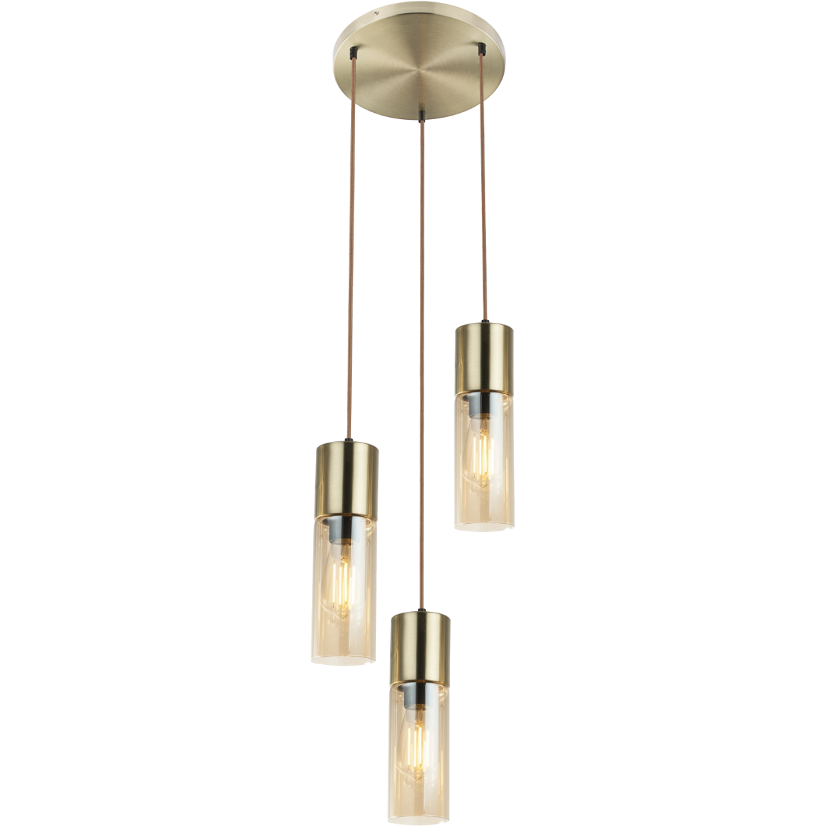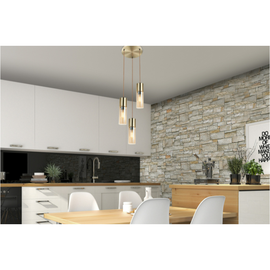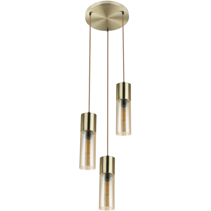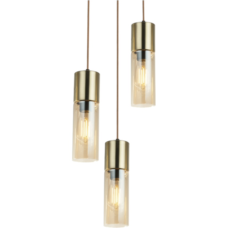 A kerek matt arany mennyezetrózsából barna textil függesztéken borostyán színű három üvegbúrát lógattunk le. A búra színe miatt meleg hatású, kellemes légkör érhető ezzel a modellel, melyet tovább tudunk fokozni a sorozat többi kombinációjával. Javasoljuk LED fényforrás használatát a hosszú élettartam, a takarékos fogyasztás és választható színhőmérséklet miatt.