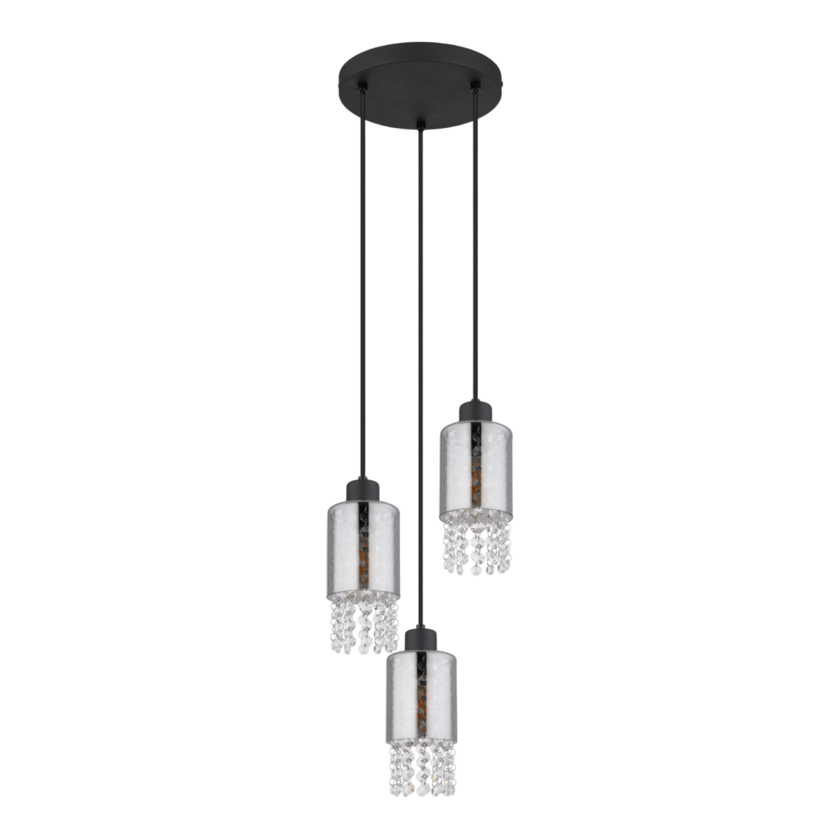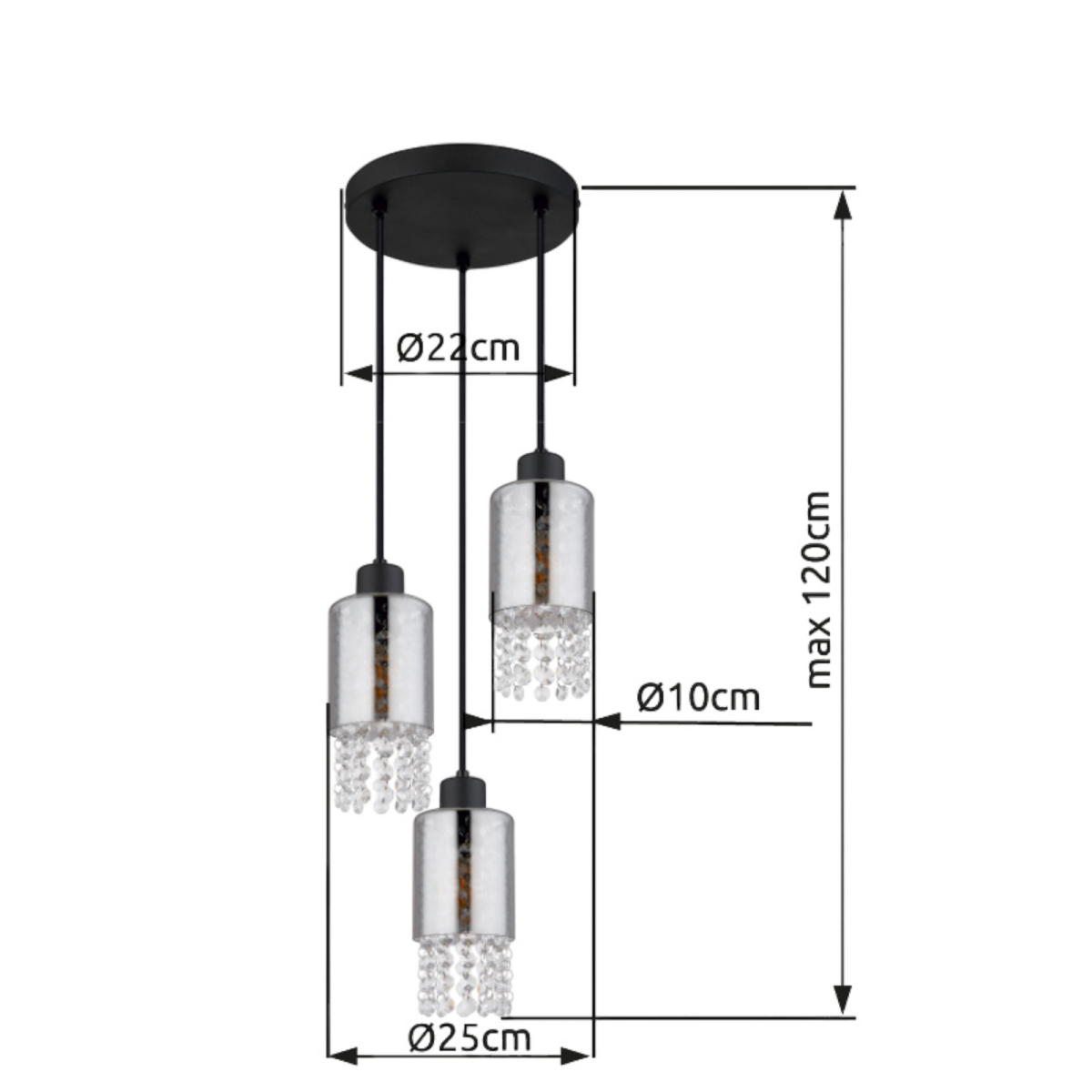 A GLOBO 15799-3H elegáns függőlámpája a BACKEY sorozatból nagyszerű dizájnnal rendelkezik. A kerek mennyezeti lámpatesttől (Ø 25 cm) három, akár 1,2 m hosszú fekete kábel fut egy-egy E27-es foglalathoz, amelyeket füstszínű, kristály díszítésű, henger alakú üvegbúra vesz körül. Az E27-es foglalatok lehetővé teszik a fény színének és fényerejének megválasztását 3x15 W maximális teljesítményig. A hosszú élettartam és az energiatakarékosság miatt a LED izzókat ajánljuk.