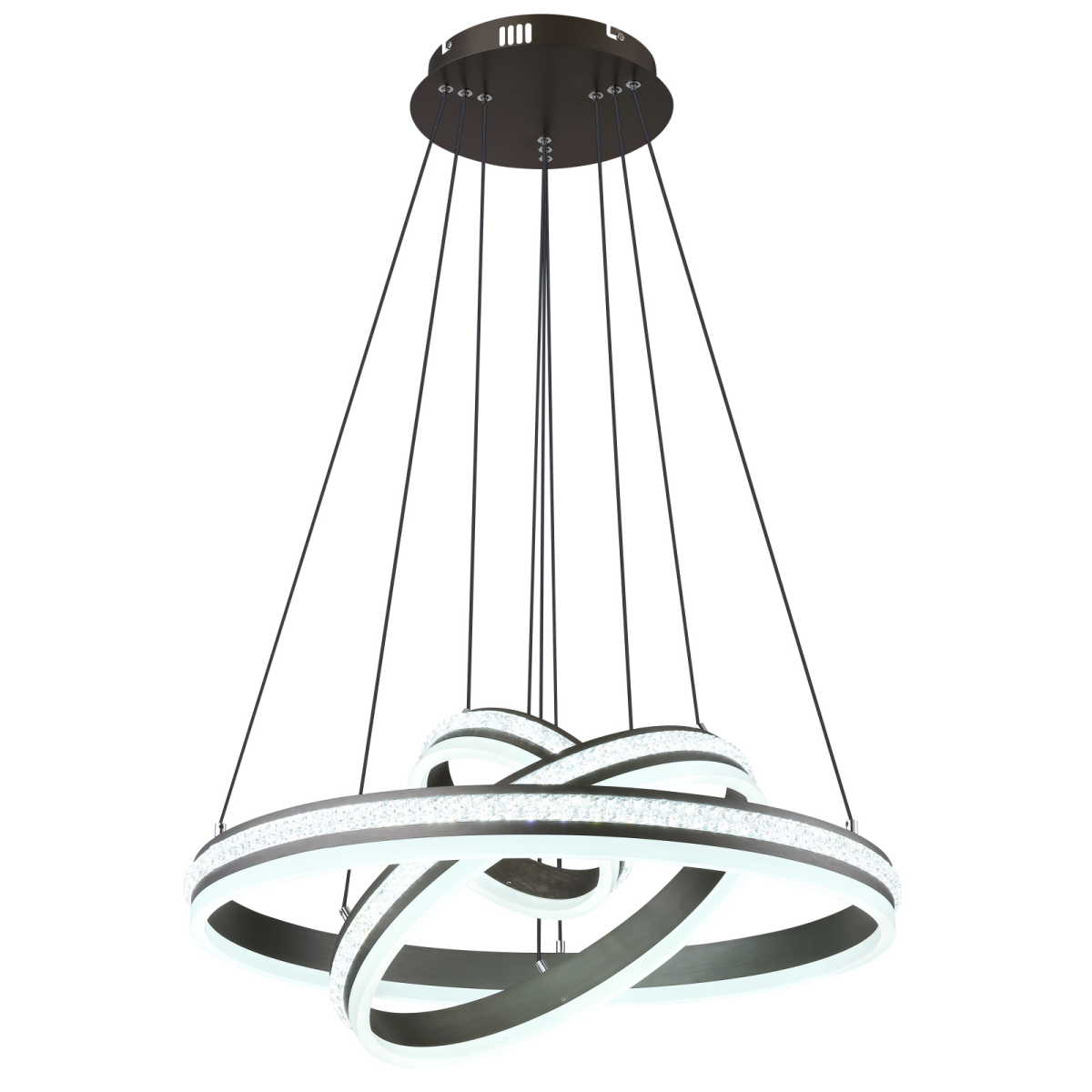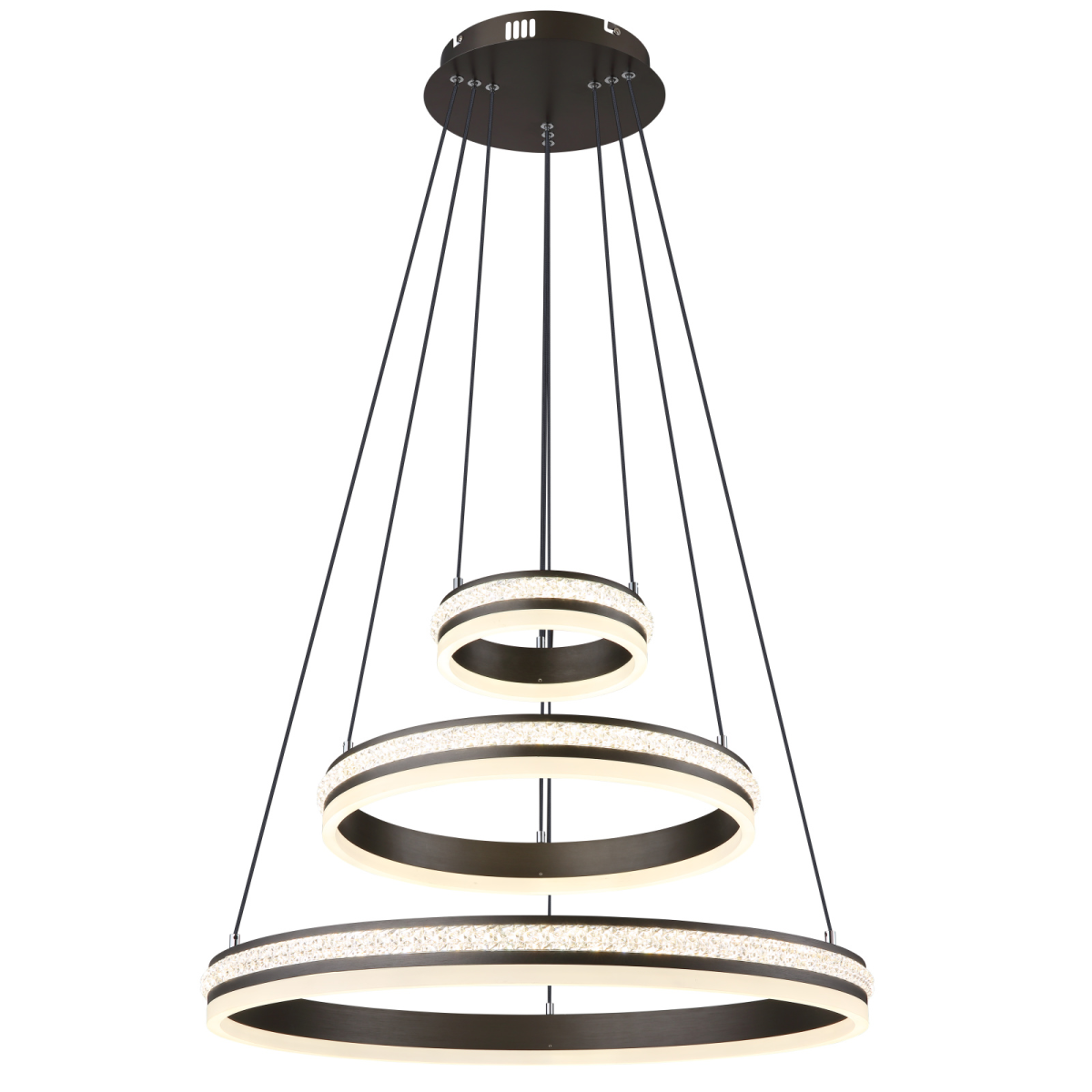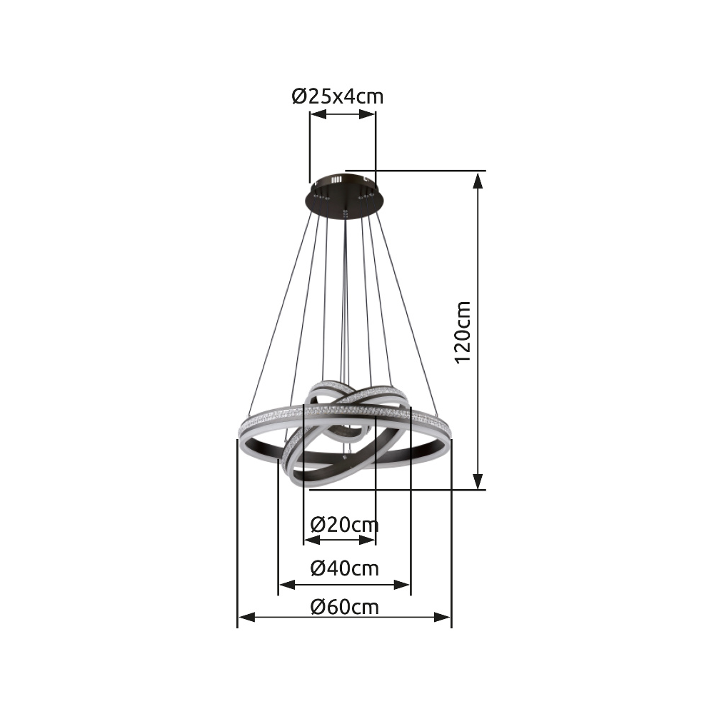 Üdvözlünk a GROUNI függőlámpa világában, amely az elegancia és az innováció kombinációja! A csiszolt titánszínű fém és az átlátszó műanyag kristály fehér színű akrillal kombinálva lenyűgöző világítási hangulatot teremt. Ez a dimmelhető függőlámpa különböző lehetőségeket kínál, hogy a fali kapcsolón keresztül több fokozatban megváltoztathasd a fényt és a színeket. A memóriafunkciónak, a praktikus éjszakai világításnak és a magasság beállításának köszönhetően a GROUNI lámpatestet az egyéni igényeid szerint módosíthatod. Az elemekkel (2x AAA) ellátott távirányító kényelmes működtetést tesz lehetővé. A függeszték a 20 cm, 40 cm és 60 cm átmérőjű gyűrűivel nagyvonalú megvilágítást biztosít. A GROUNI energiatakarékos 70 W-os LED-et tartalmaz, amely lenyűgöző, 3510 lumen fényerővel rendelkezik. Merítsd otthonodat harmonikus fénybe, és élvezd a GROUNI függőlámpa teljes pompáját.