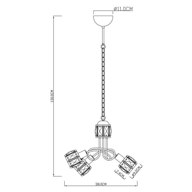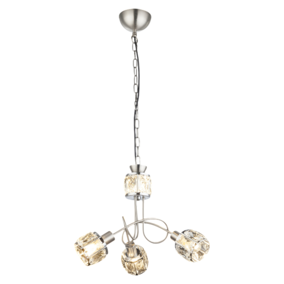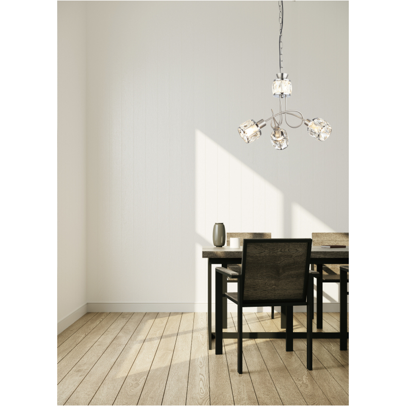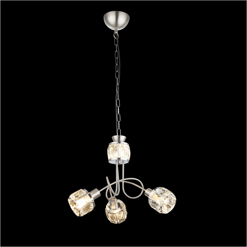Ez a csillár nikkel matt vázból és egy elegáns víztiszta üveg-kristály alkotta fejből áll, melytől igazán elegáns kinézetet kap. 3 db E14-es foglalattal rendelkezik, mely 3 db maximum 40W teljesítményű fényforrással üzemeltethető.