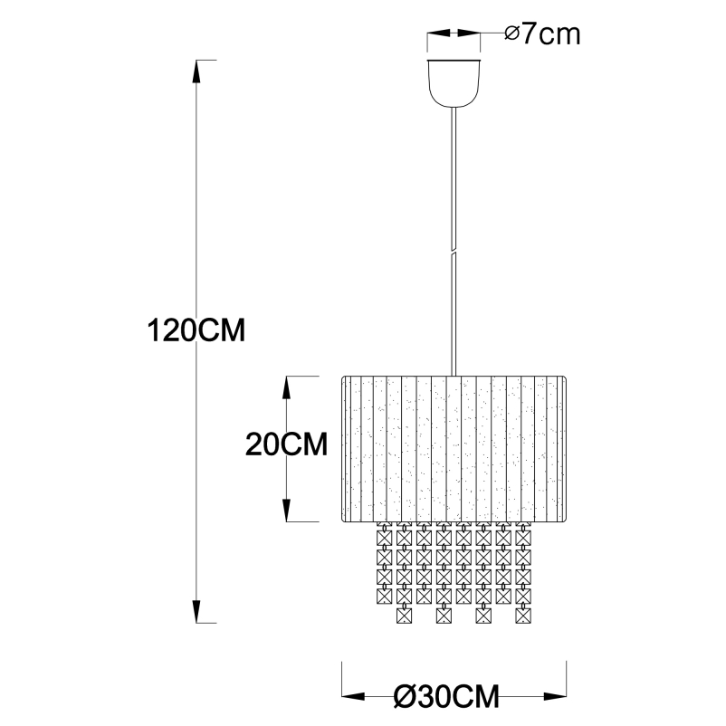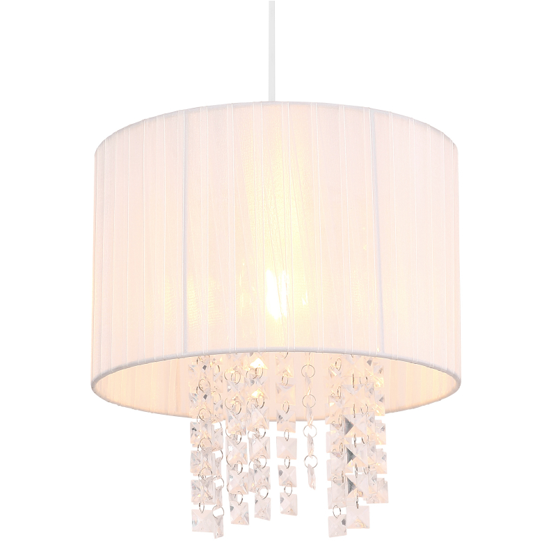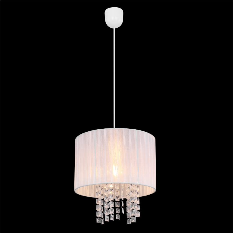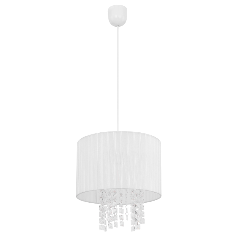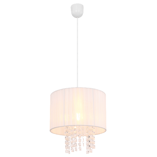 Pyra függeszték fehér selyem ernyővel, akril-kristály függő dekorral, mely igen exkluzív megjelenést kölcsönöz a lámpának. A függeszték E27-es foglalattal rendelkezik, mely maximum 60W teljesítményű fényforrással üzemeltethető.