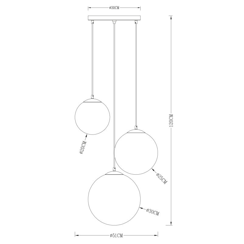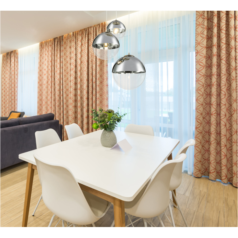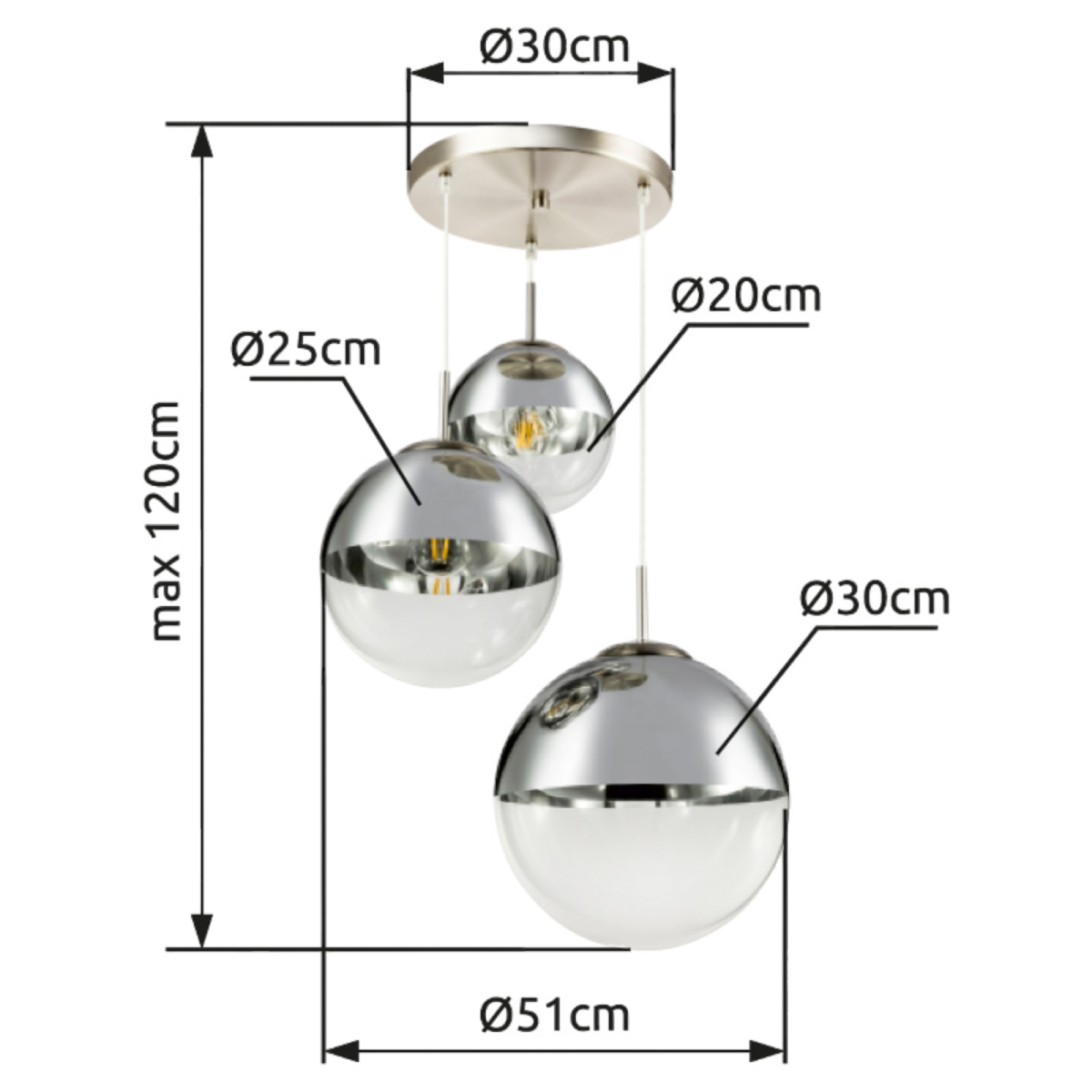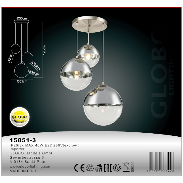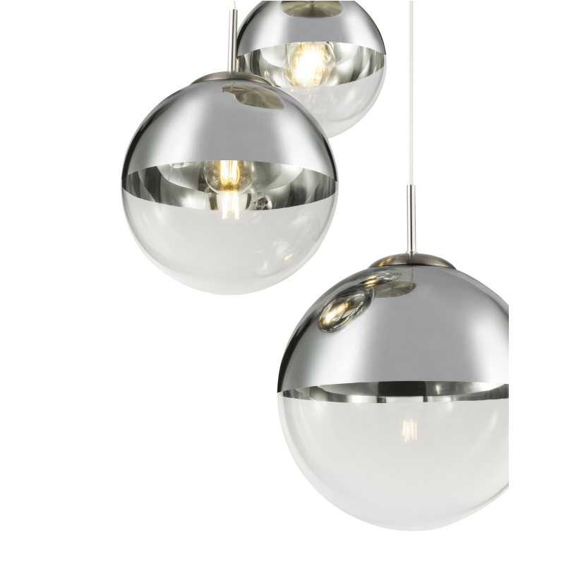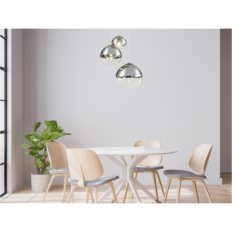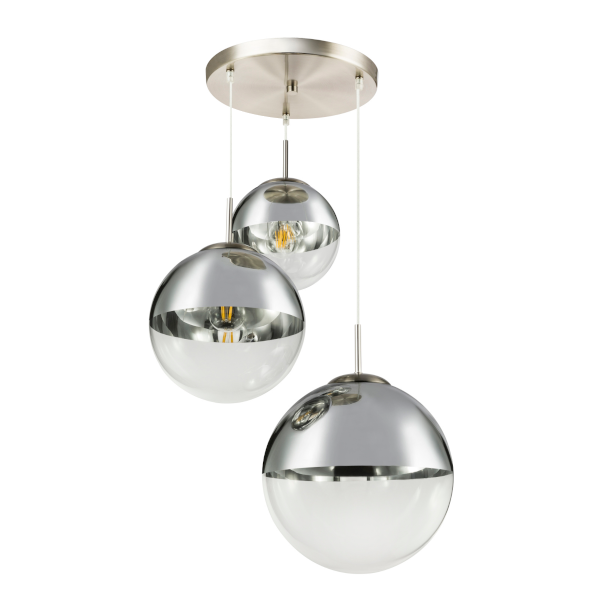 3 db E27-es foglalattal rendelkezik, mely 3 db maximum 40W teljesítményű fényforrással üzemeltethetó. A króm függesztéken van elhelyezve a 3 különböző méretű (20, 25, 30 cm) üveggömb, mely különleges hatást kölcsönöz a lámpának. A gömbök felső része ezüst színűre lett festve, hogy a harmónia még jobb legyen.