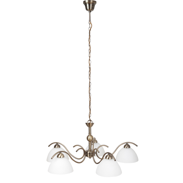 Klasszikus megjelenésű csillár 5 db foglalattal. 107,5 cm lelógású, 74 cm átmérőjű, bronz színű fém lámpatest fehér színű üveg lámpabúrákkal. A függeszték E-14-es foglalatú, max. 5x 40W teljesítményű energiatakarékos fényforrásokkal is használható.